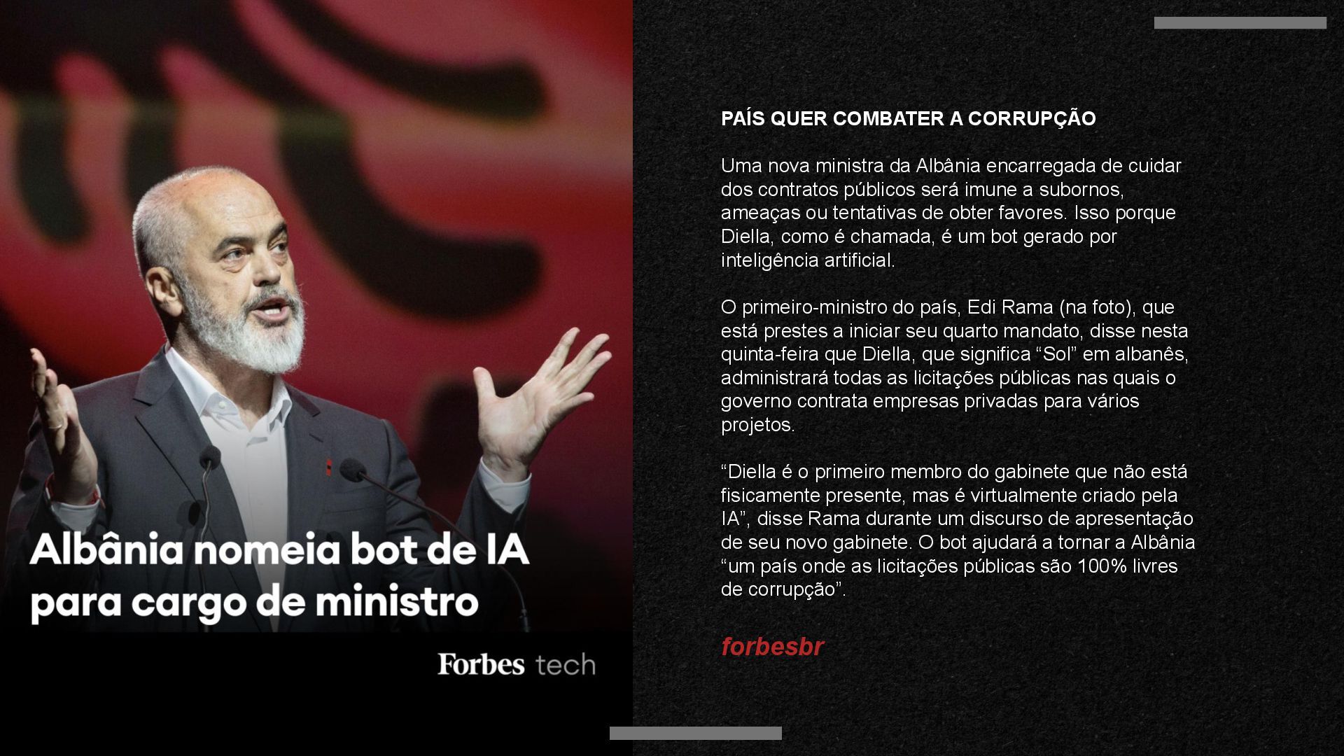 encarregada de cuidar dos contratos públicos será imune a subornos, ameaças ou tentativas de obter favores. Isso porque Diella, como é chamada, é um bot gerado por inteligência artificial. O primeiro-ministro do país, Edi Rama (na foto), que está prestes a iniciar seu quarto mandato, disse nesta quinta-feira que Diella, que significa “Sol” em albanês, administrará todas as licitações públicas nas quais o governo contrata empresas privadas para vários projetos. “Diella é o primeiro membro do gabinete que não está fisicamente presente, mas é virtualmente criado pela IA”, disse Rama durante um discurso de apresentação de seu novo gabinete. O bot ajudará a tornar a Albânia “um país onde as licitações públicas são 100% livres de corrupção”. forbesbr