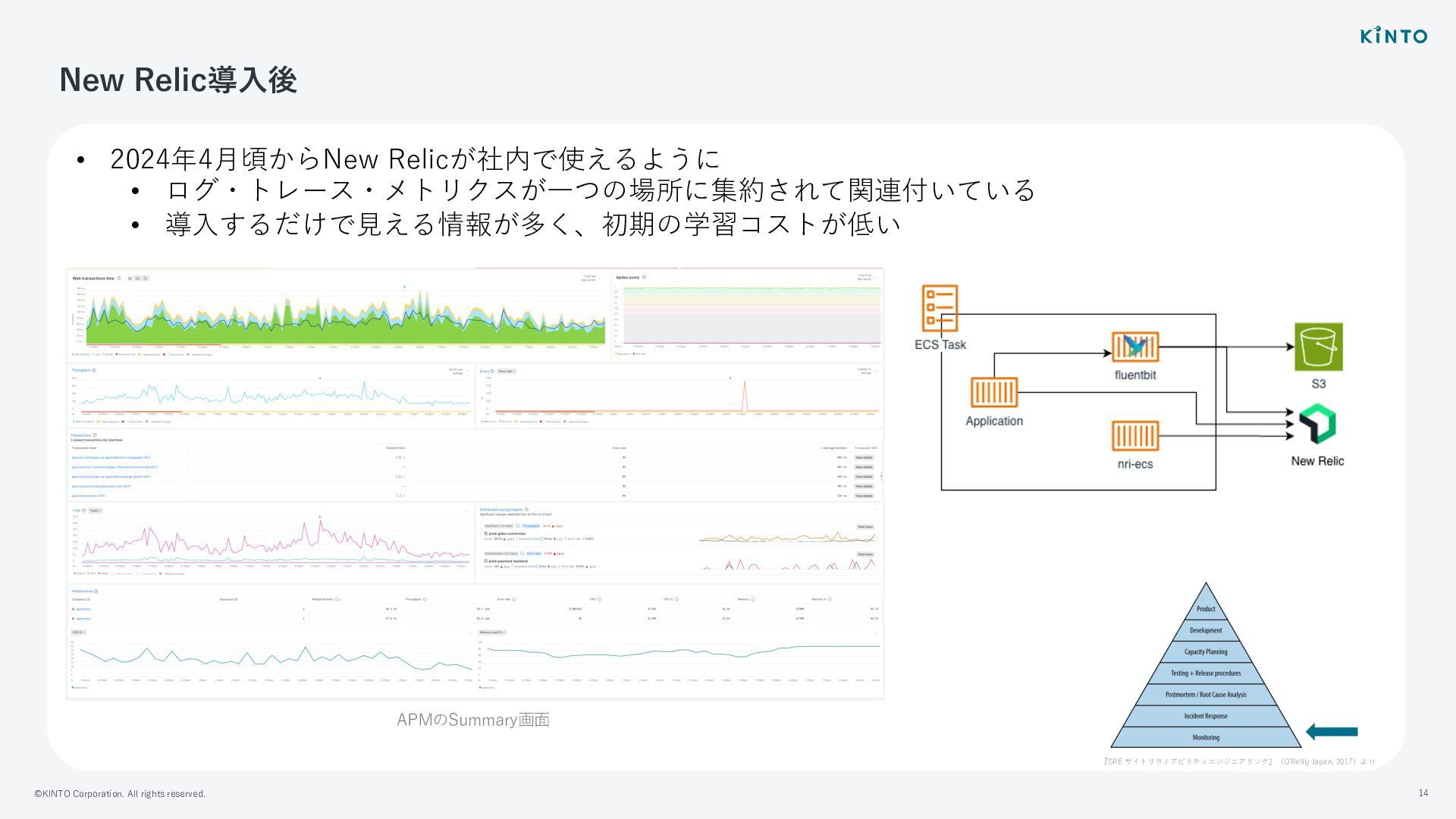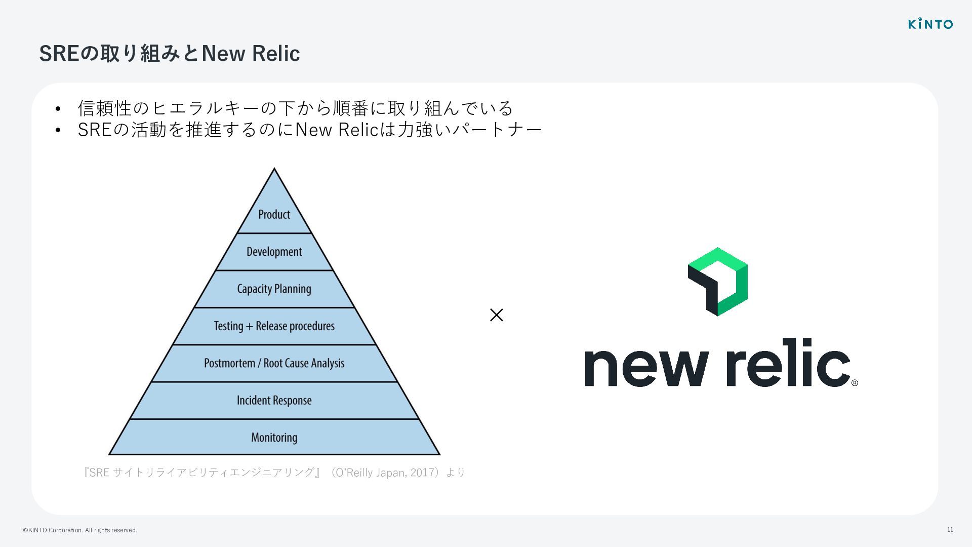 ©KINTO Corporation. All rights reserved. 11 SREの取り組みとNew Relic • 信頼性のヒエラルキーの下から順番に取り組んでいる