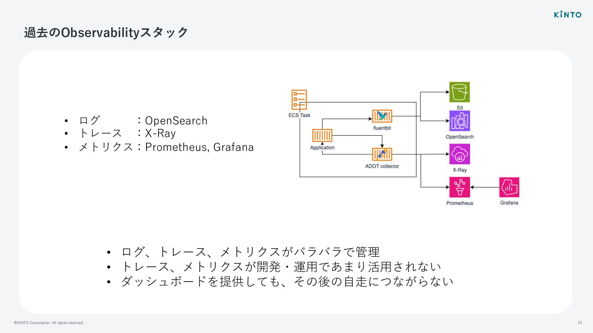 ©KINTO Corporation. All rights reserved. 13 過去のObservabilityスタック • ログ :OpenSearch