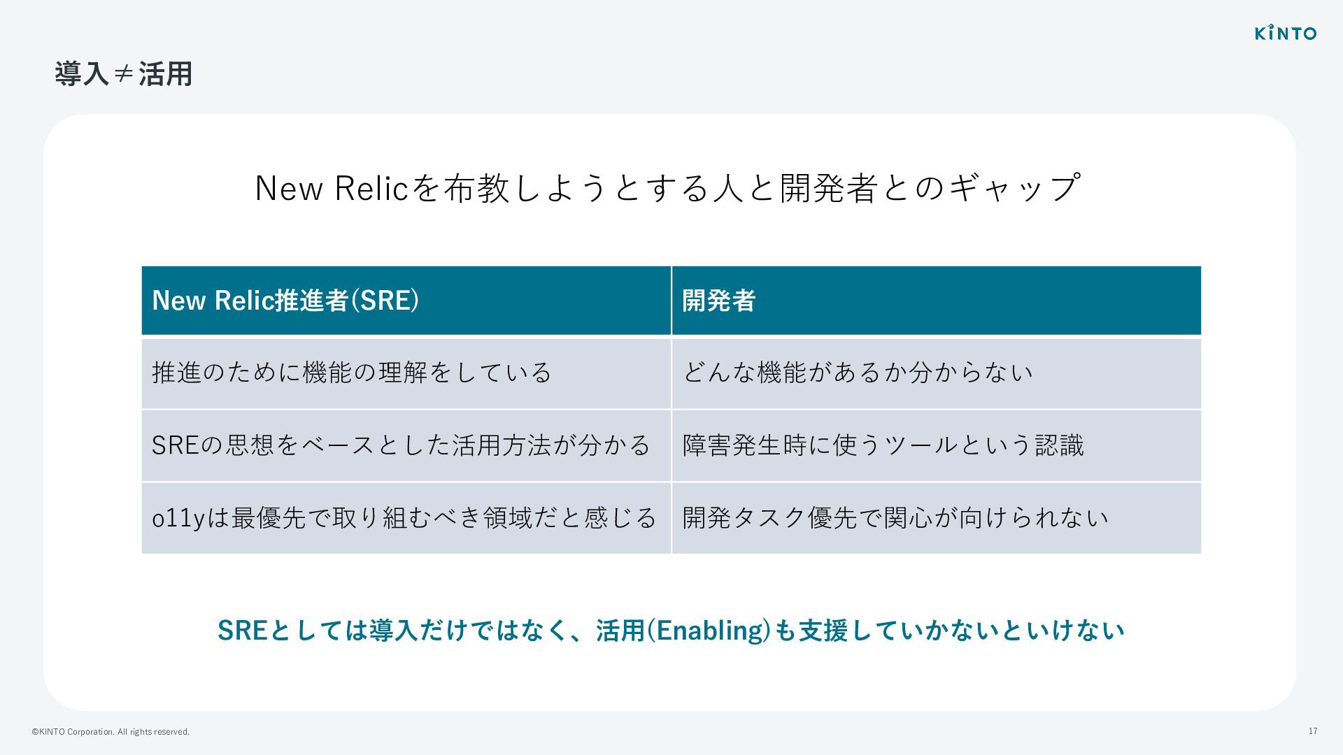 ©KINTO Corporation. All rights reserved. 17 導⼊≠活⽤ New Relicを布教しようとする⼈と開発者とのギャップ New