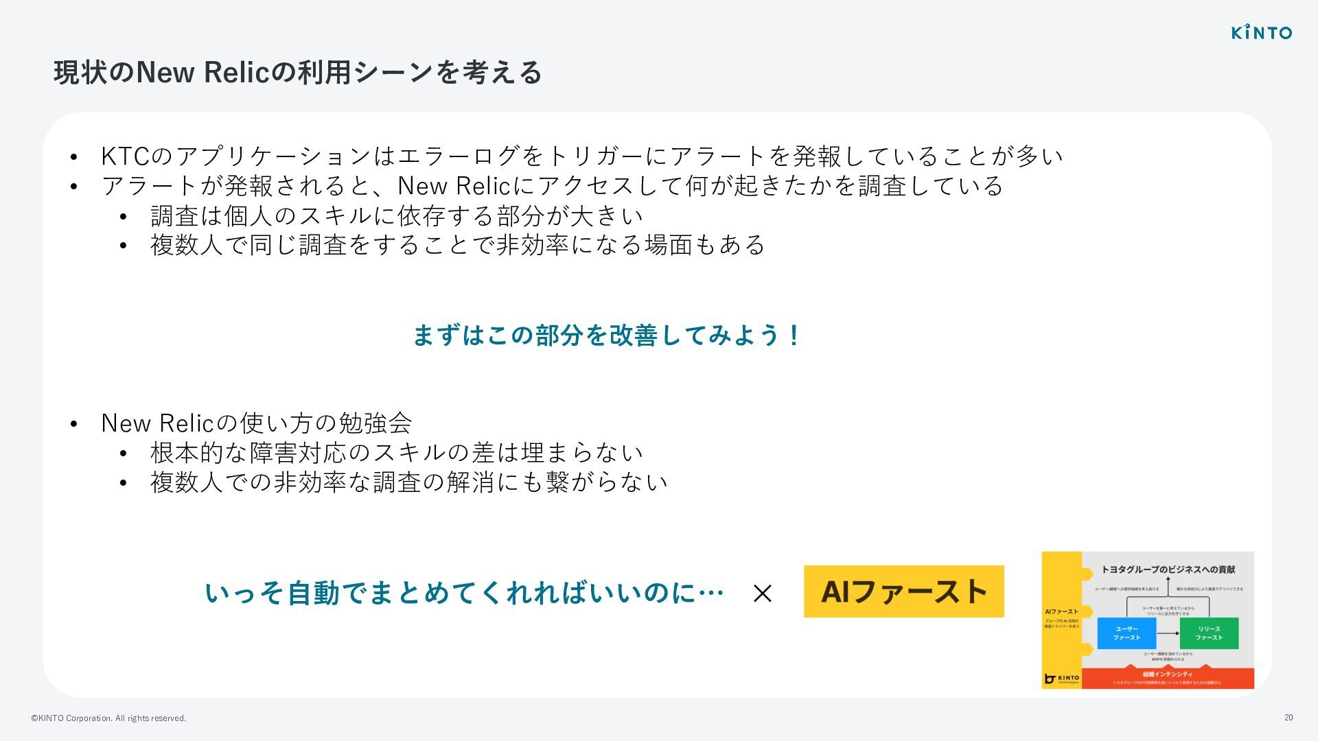 ©KINTO Corporation. All rights reserved. 20 現状のNew Relicの利⽤シーンを考える • KTCのアプリケーションはエラーログをトリガーにアラートを発報していることが多い