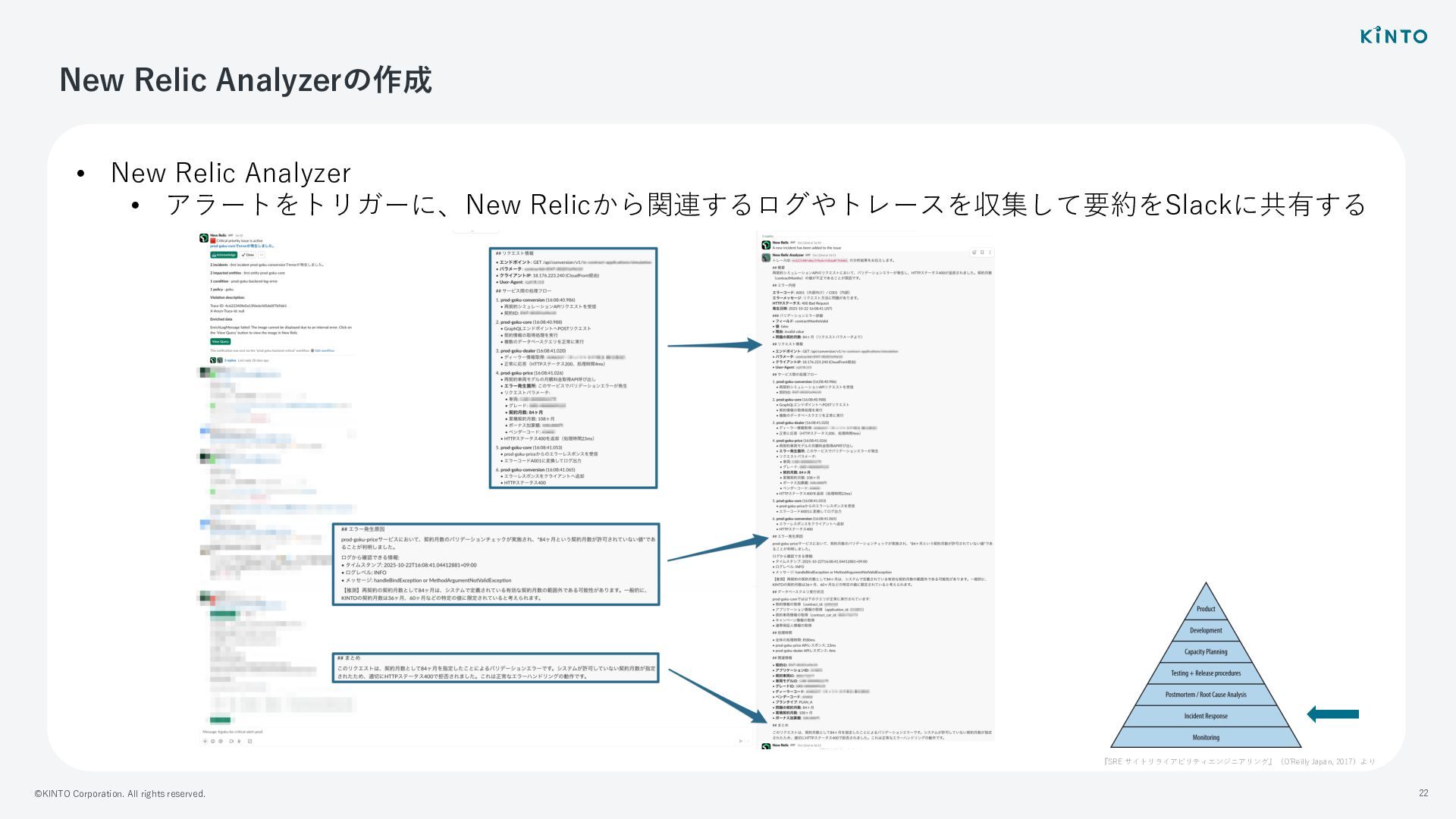 New Relic Analyzer • アラートをトリガーに、New Relicから関連するログやトレースを収集して要約をSlackに共有する 『SRE サイトリライアビリティエンジニアリング』(OʼReilly Japan, 2017)より