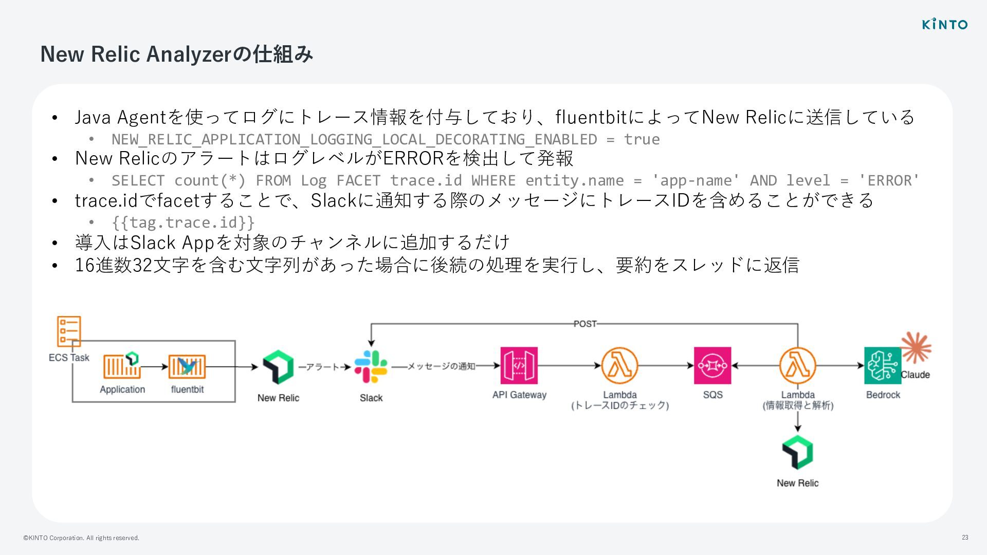 Java Agentを使ってログにトレース情報を付与しており、fluentbitによってNew Relicに送信している • NEW_RELIC_APPLICATION_LOGGING_LOCAL_DECORATING_ENABLED = true • New RelicのアラートはログレベルがERRORを検出して発報 • SELECT count(*) FROM Log FACET trace.id WHERE entity.name = 'app-name' AND level = 'ERROR' • trace.idでfacetすることで、Slackに通知する際のメッセージにトレースIDを含めることができる • {{tag.trace.id}} • 導⼊はSlack Appを対象のチャンネルに追加するだけ • 16進数32⽂字を含む⽂字列があった場合に後続の処理を実⾏し、要約をスレッドに返信