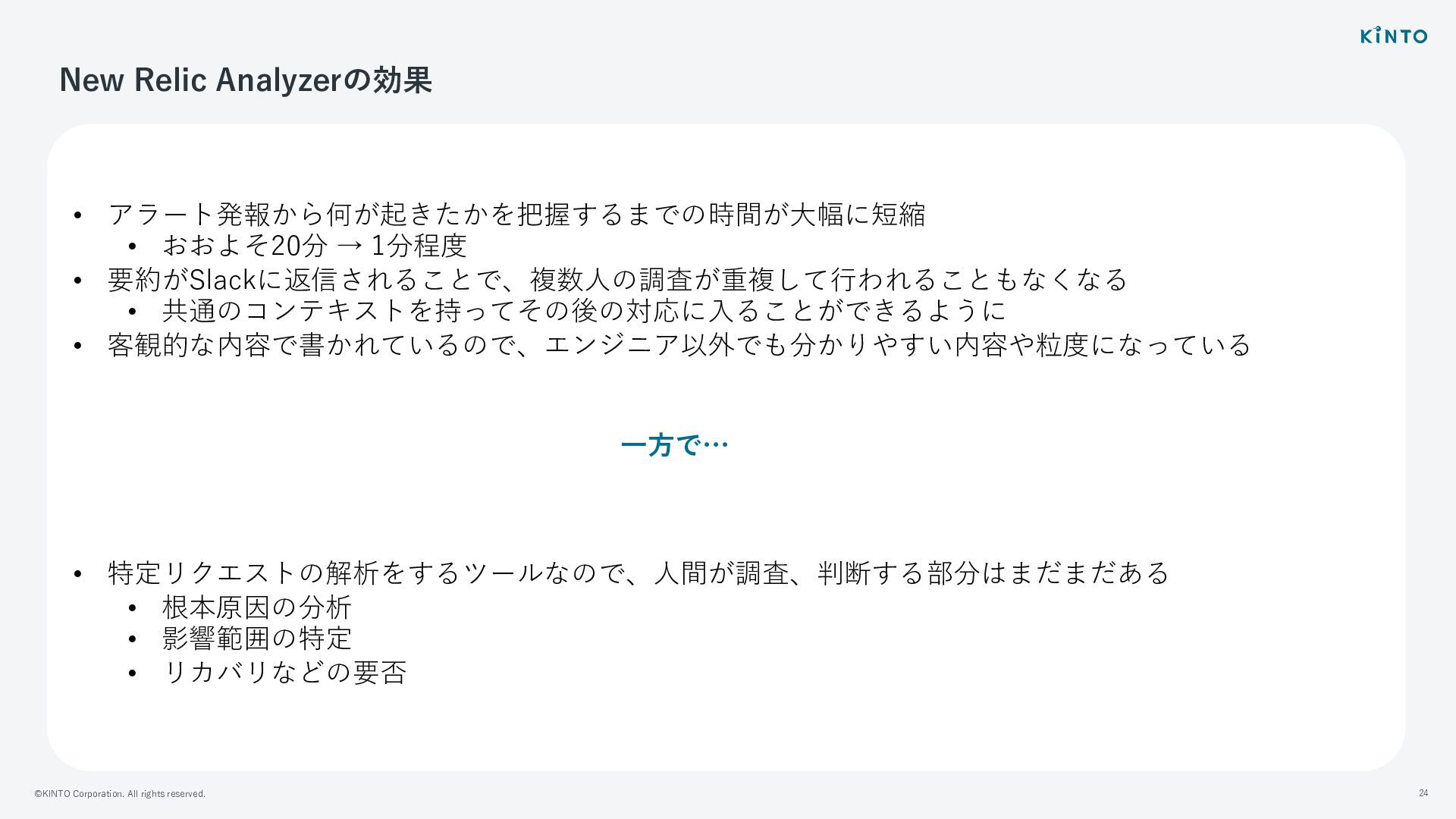 ©KINTO Corporation. All rights reserved. 24 • アラート発報から何が起きたかを把握するまでの時間が⼤幅に短縮 • おおよそ20分