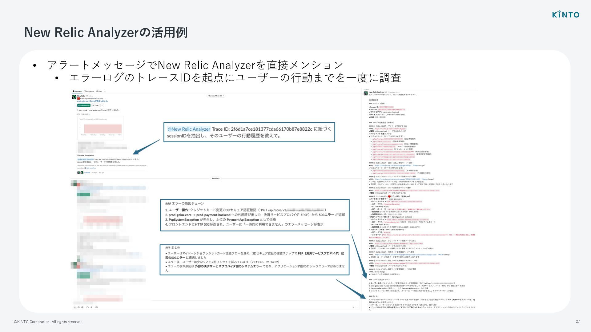 アラートメッセージでNew Relic Analyzerを直接メンション • エラーログのトレースIDを起点にユーザーの⾏動までを⼀度に調査