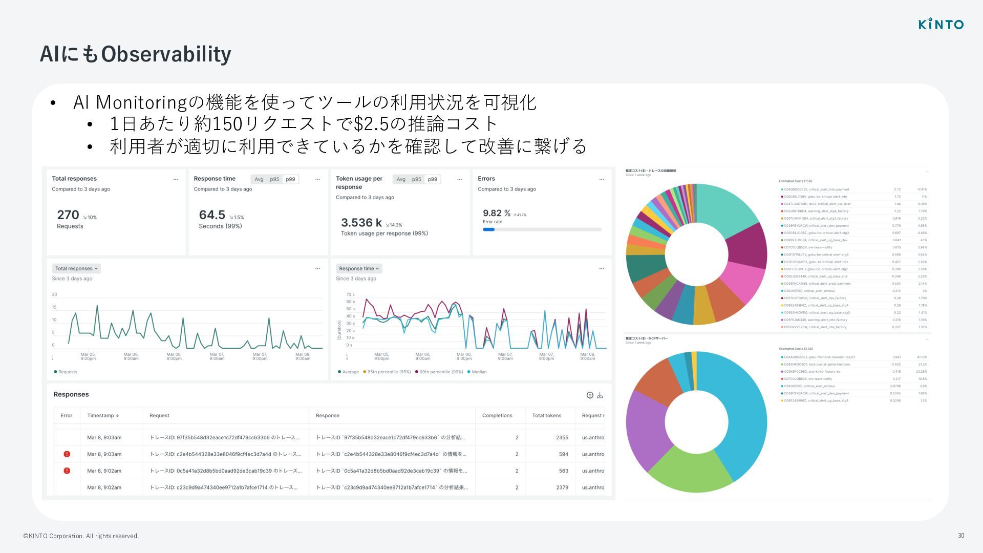©KINTO Corporation. All rights reserved. 30 AIにもObservability • AI Monitoringの機能を使ってツールの利⽤状況を可視化