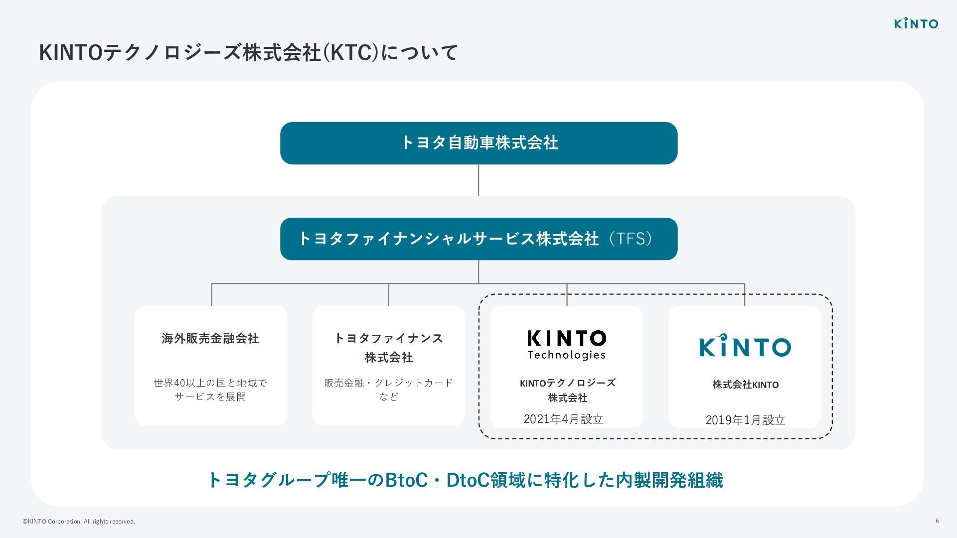 ©KINTO Corporation. All rights reserved. 6 KINTOテクノロジーズ株式会社(KTC)について トヨタ⾃動⾞株式会社 トヨタファイナンシャルサービス株式会社(TFS) 海外販売⾦融会社