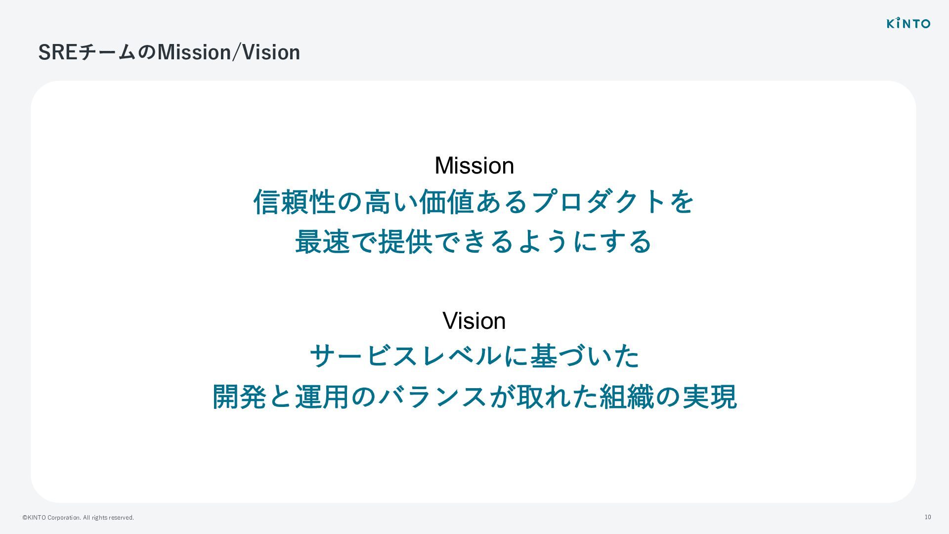 ©KINTO Corporation. All rights reserved. 10 SREチームのMission/Vision Mission 信頼性の⾼い価値あるプロダクトを 最速で提供できるようにする