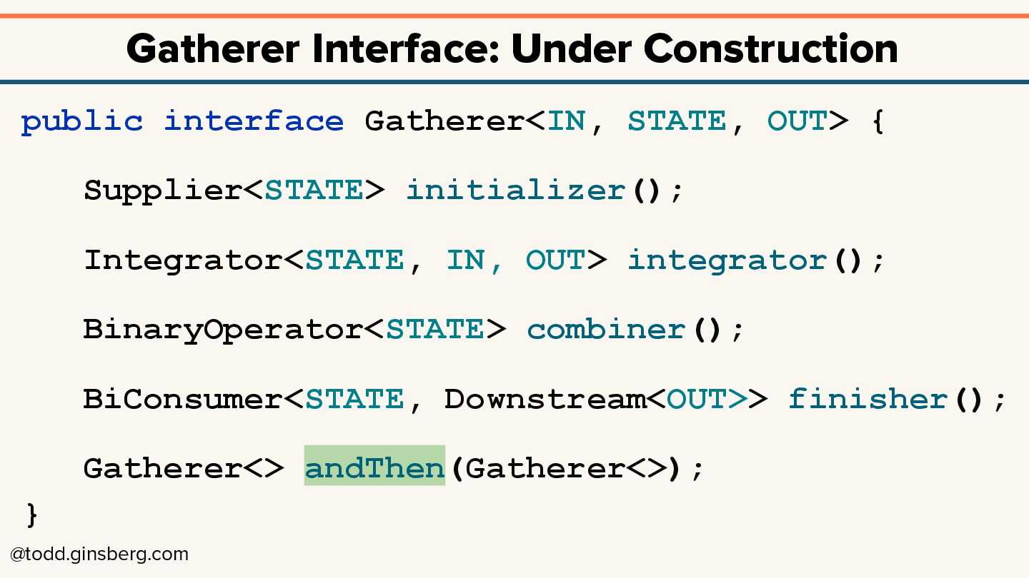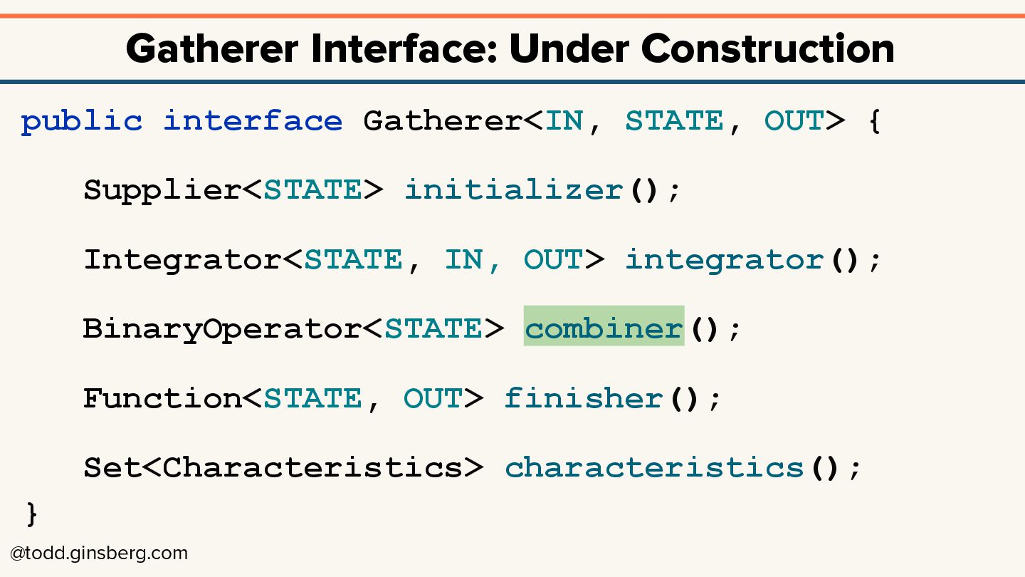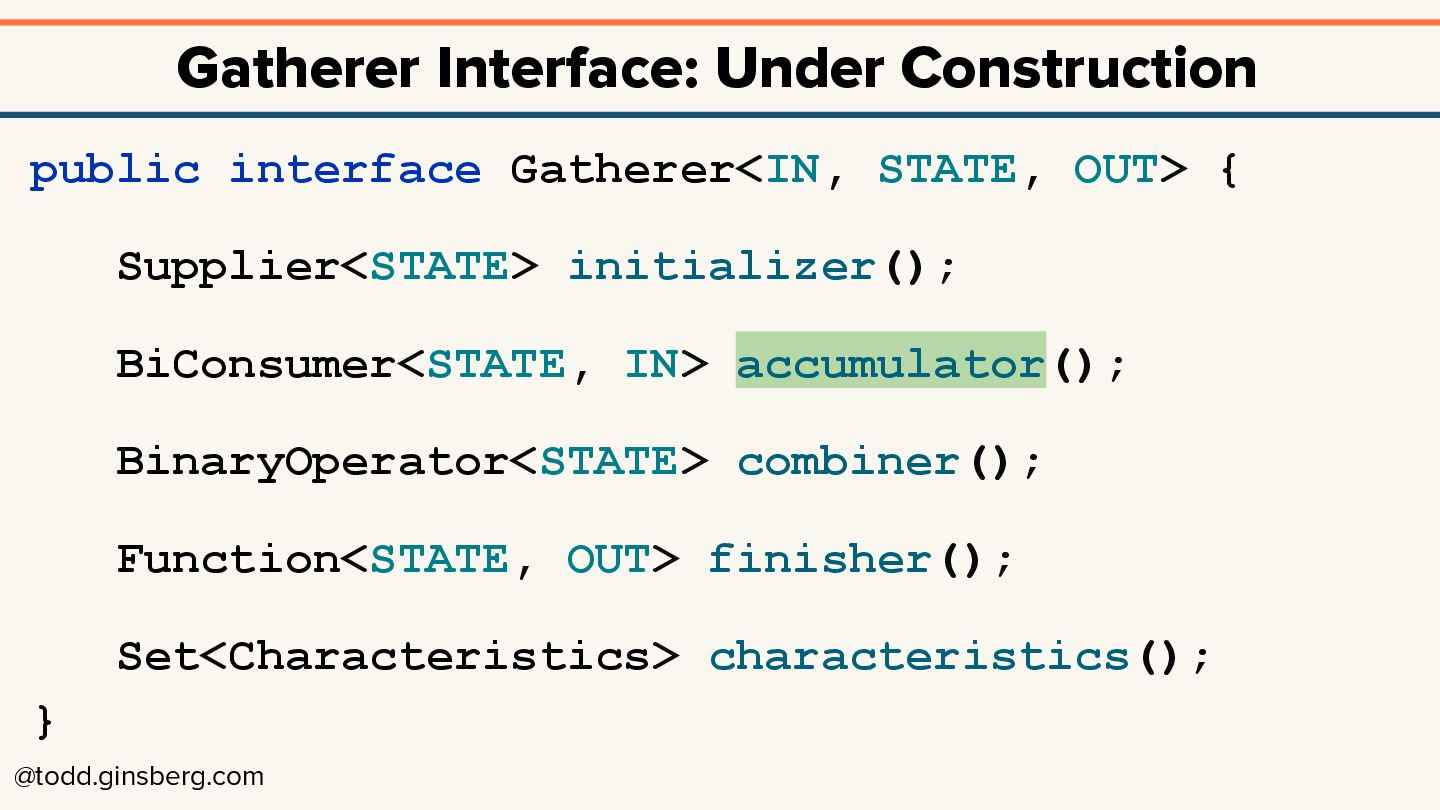 50. @todd.ginsberg.com public interface Gatherer<IN, STATE, OUT> { Supplier<STATE> initializer(); Integrator<STATE,