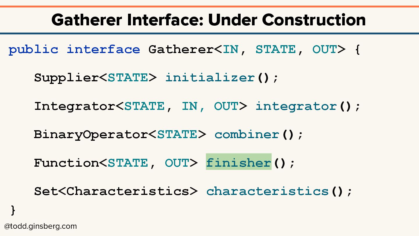 IN> integrator(); BinaryOperator<STATE> combiner(); Function<STATE, OUT> finisher(); Set<Characteristics> characteristics(); } Gatherer Interface: Under Construction
