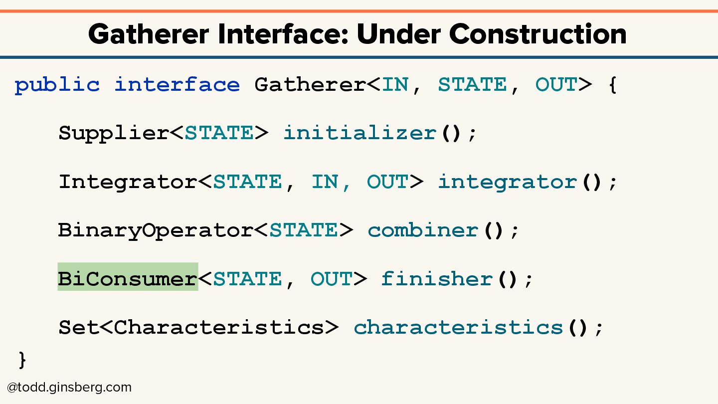 40. @todd.ginsberg.com public interface Gatherer<IN, STATE, OUT> { Supplier<STATE> initializer(); BiConsumer<STATE,