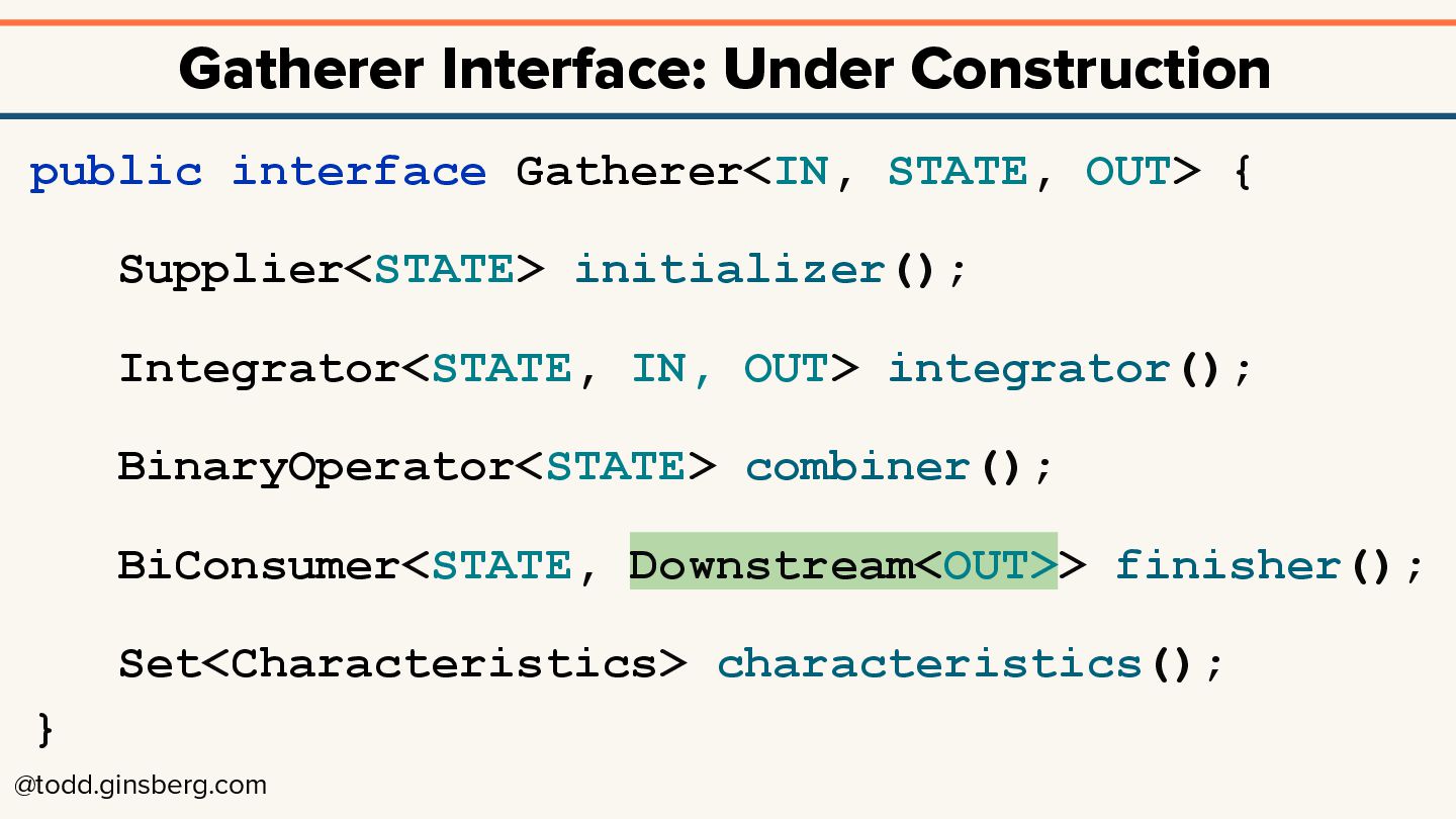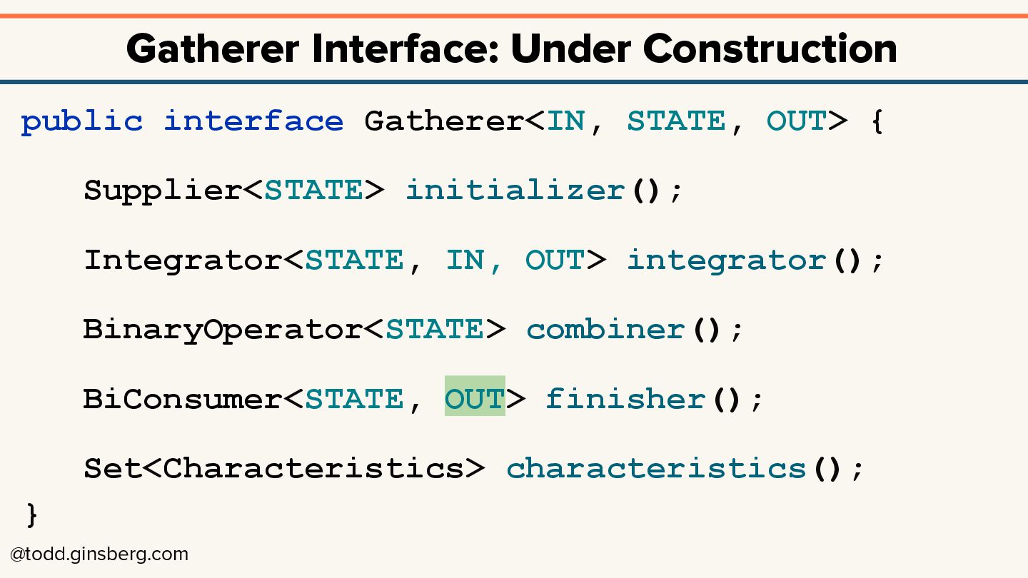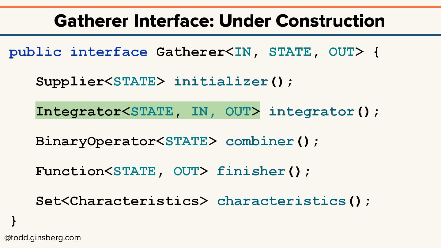 46. @todd.ginsberg.com public interface Gatherer<IN, STATE, OUT> { Supplier<STATE> initializer(); Integrator<STATE,