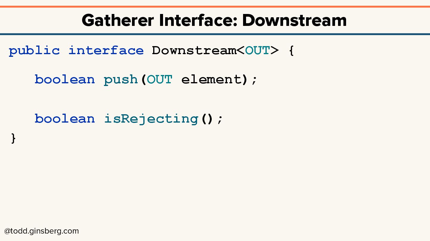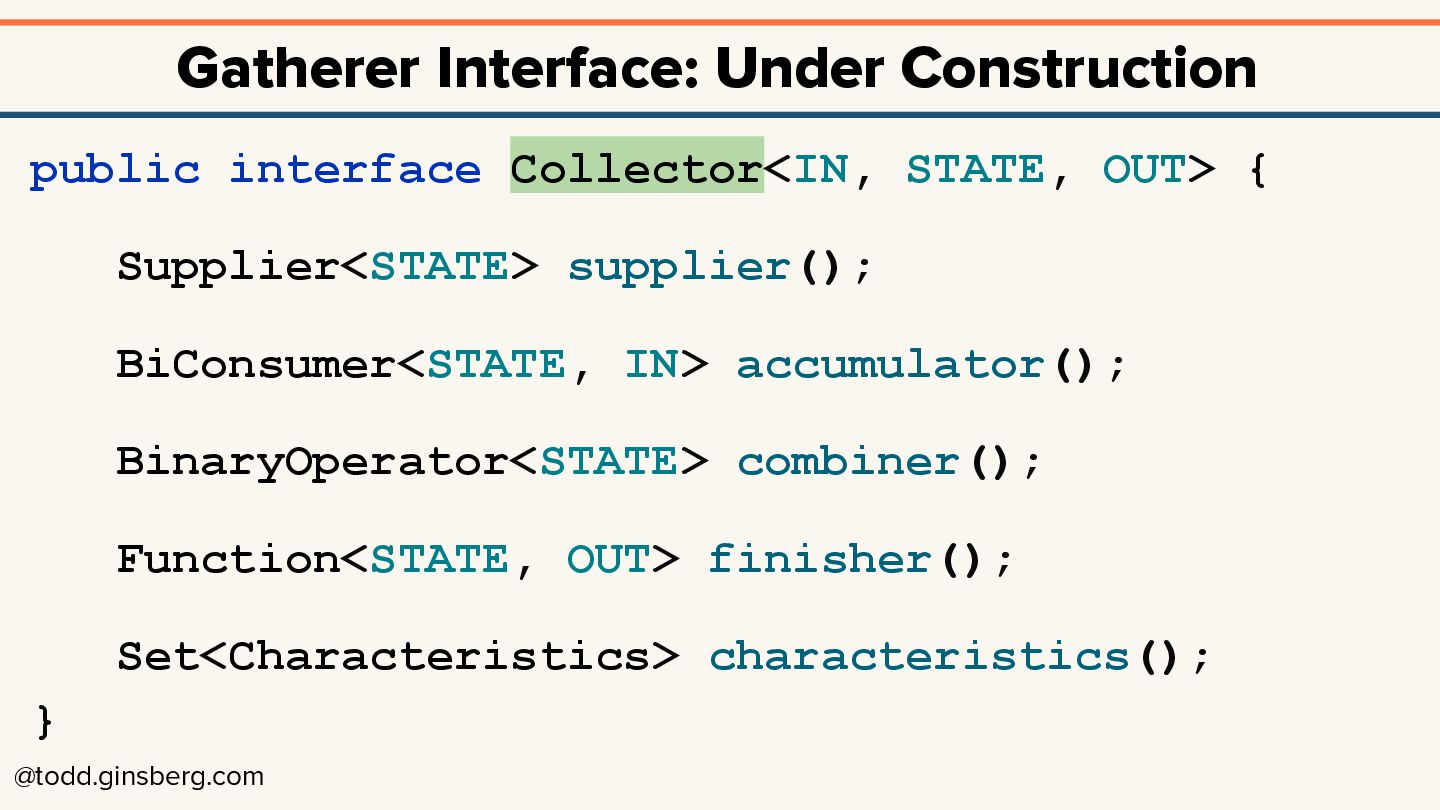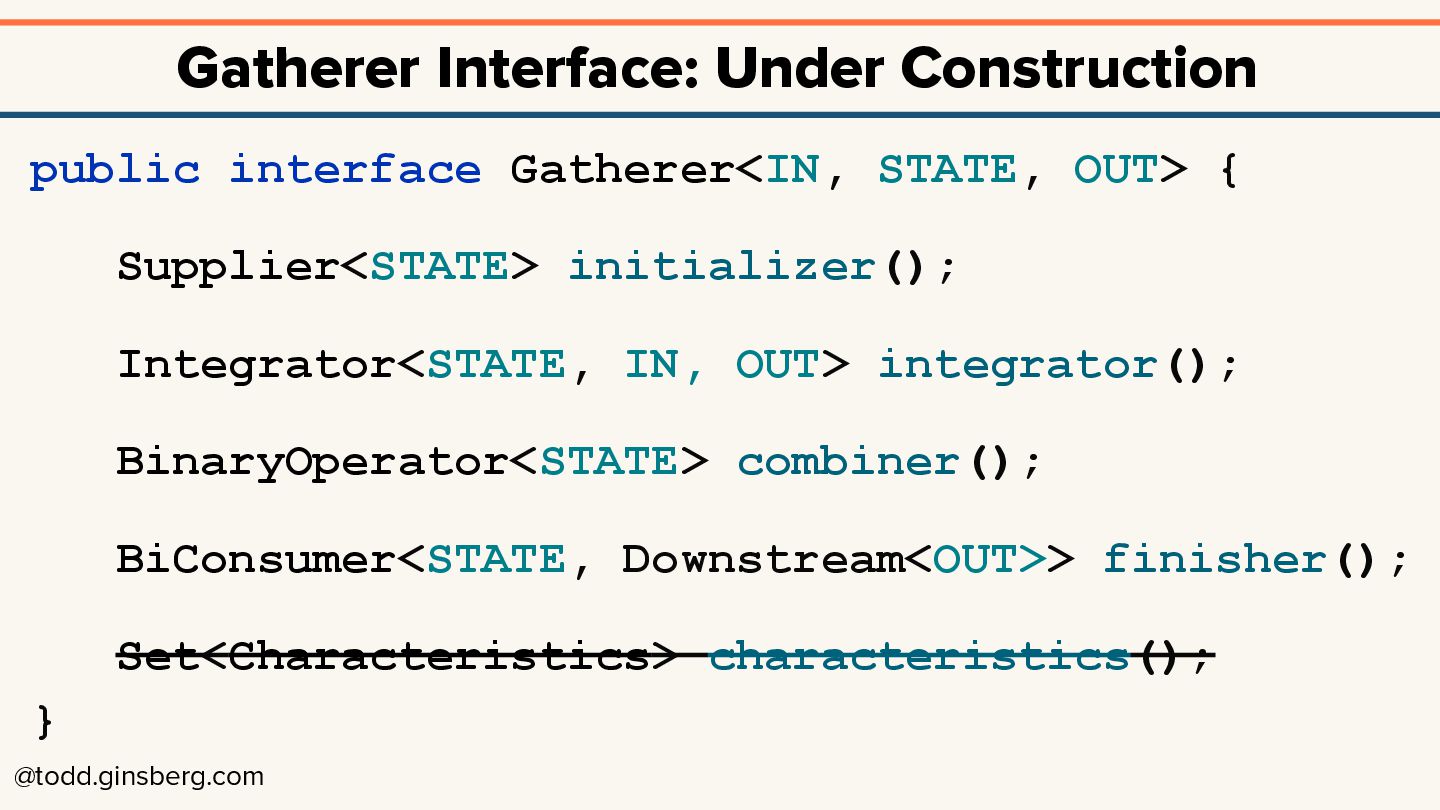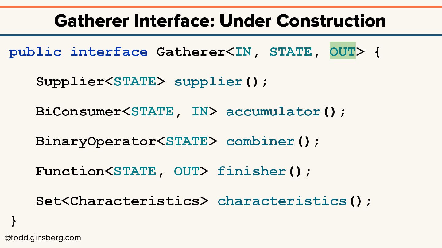 46. @todd.ginsberg.com public interface Gatherer<IN, STATE, OUT> { Supplier<STATE> initializer(); Integrator<STATE,