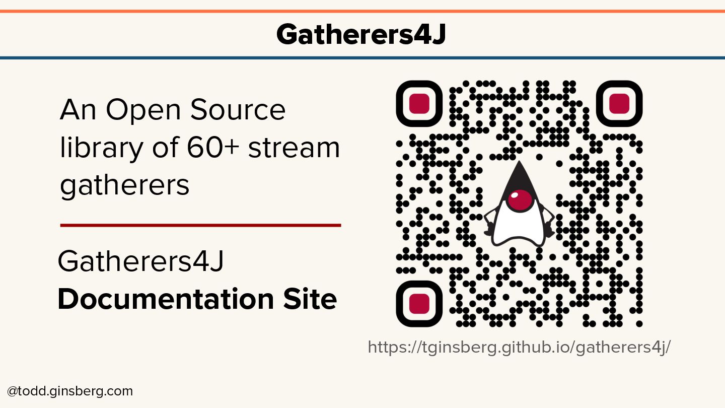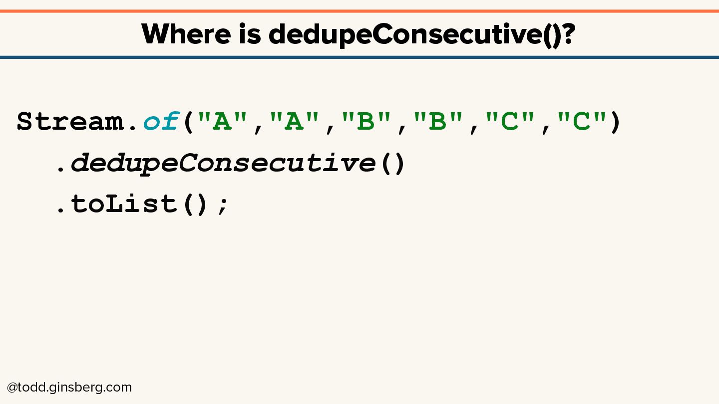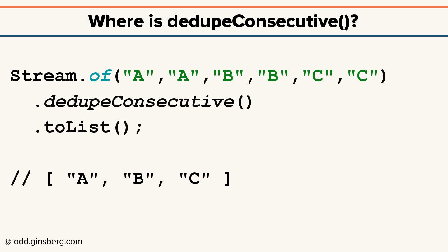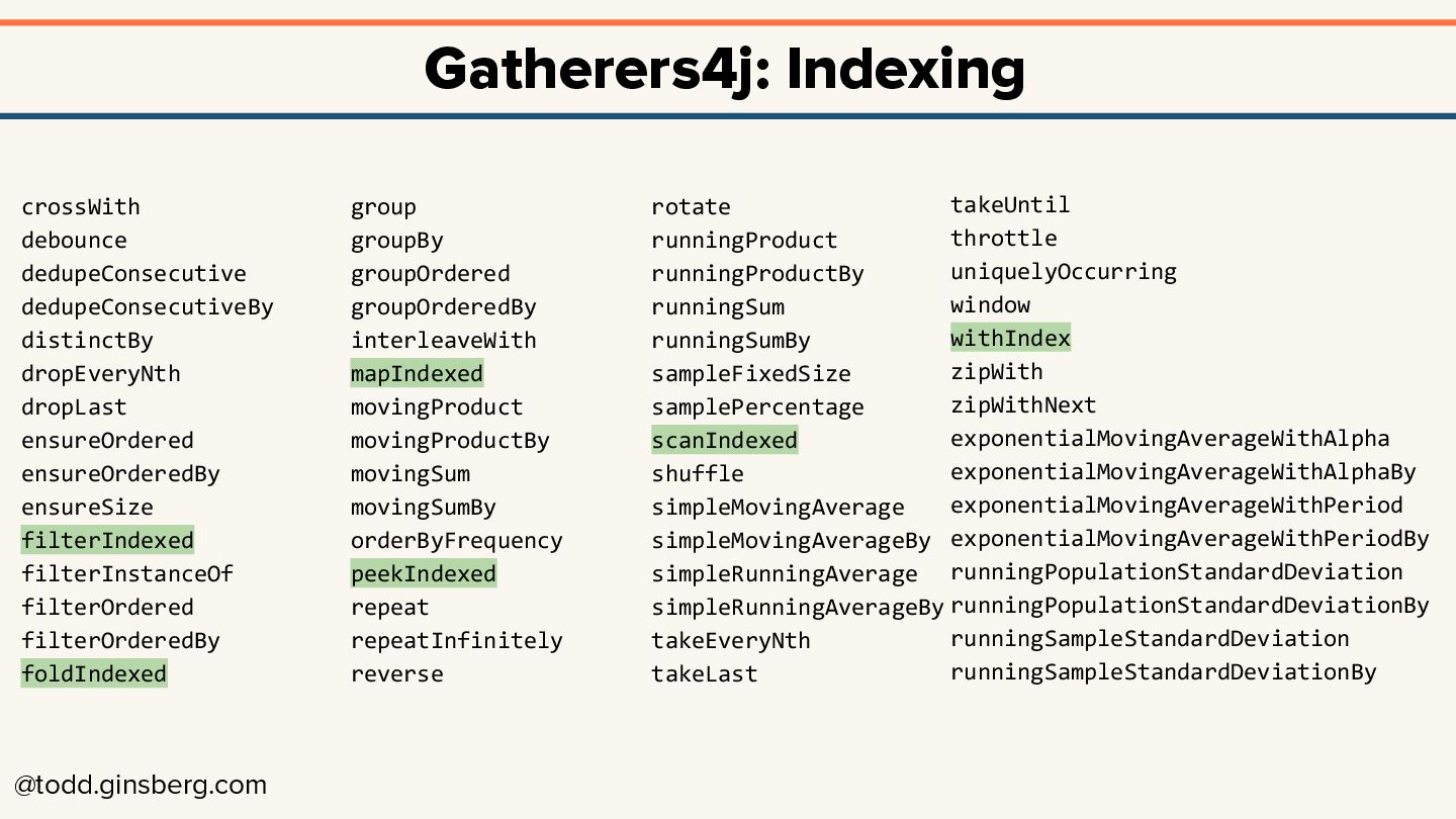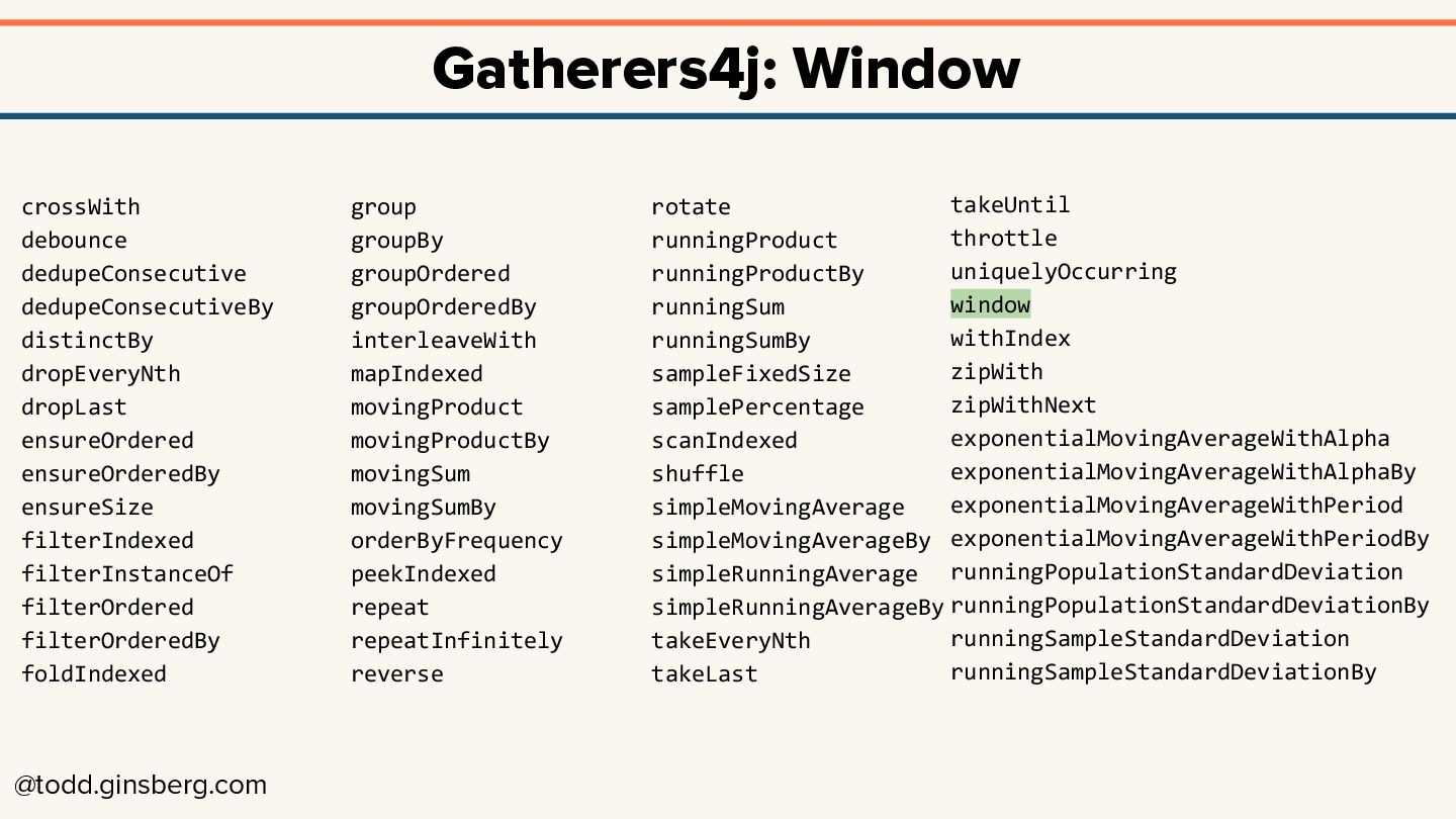 61. @todd.ginsberg.com Gatherers4j: Window crossWith debounce dedupeConsecutive dedupeConsecutiveBy distinctBy dropEveryNth dropLast