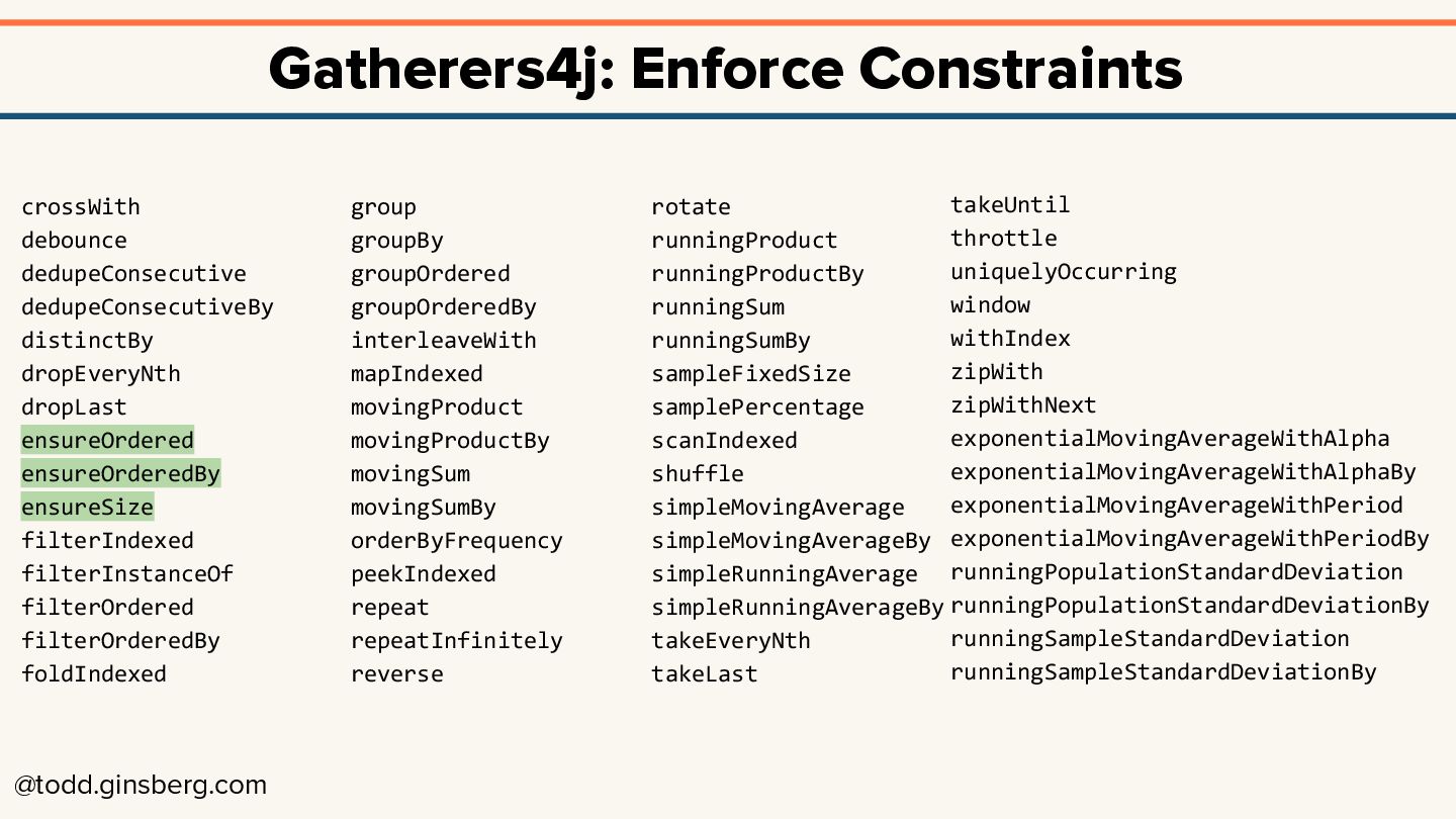 63. @todd.ginsberg.com Gatherers4j: Enforce Constraints crossWith debounce dedupeConsecutive dedupeConsecutiveBy distinctBy dropEveryNth
