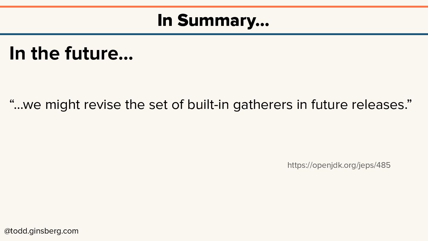 set of built-in gatherers in future releases.” https://openjdk.org/jeps/485