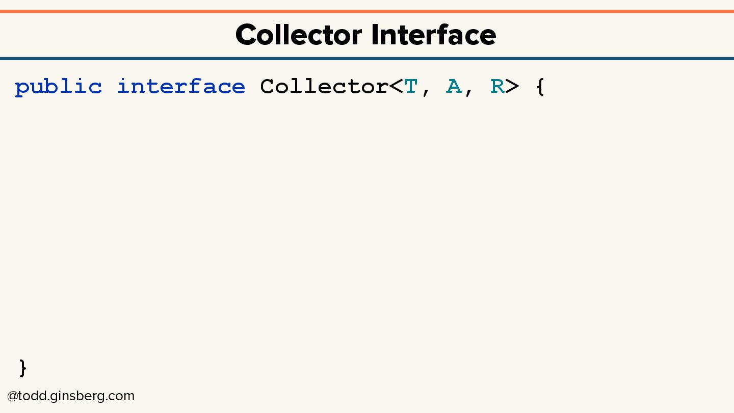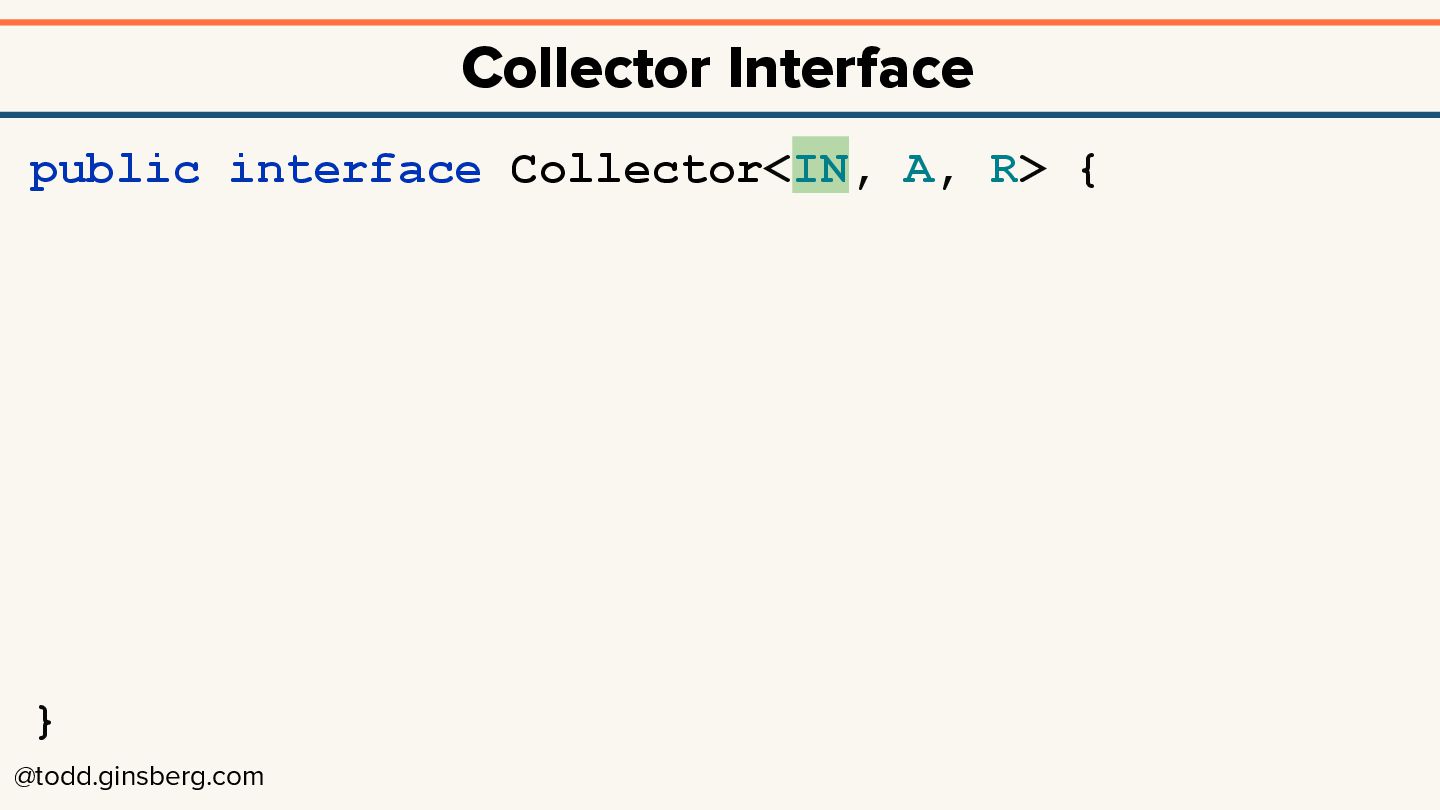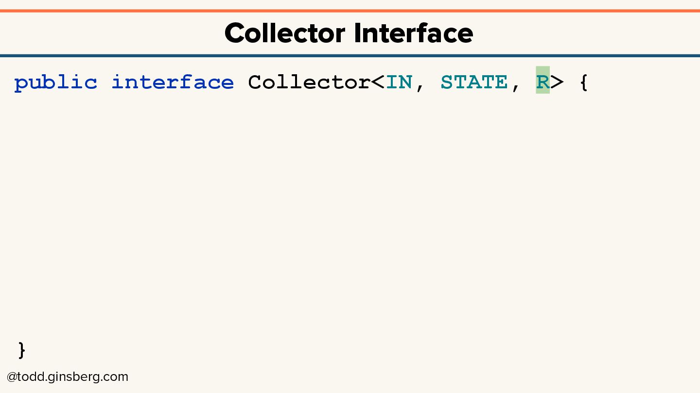 7. @todd.ginsberg.com public interface Collector<IN, STATE, OUT> { Supplier<STATE> supplier(); BiConsumer<STATE,