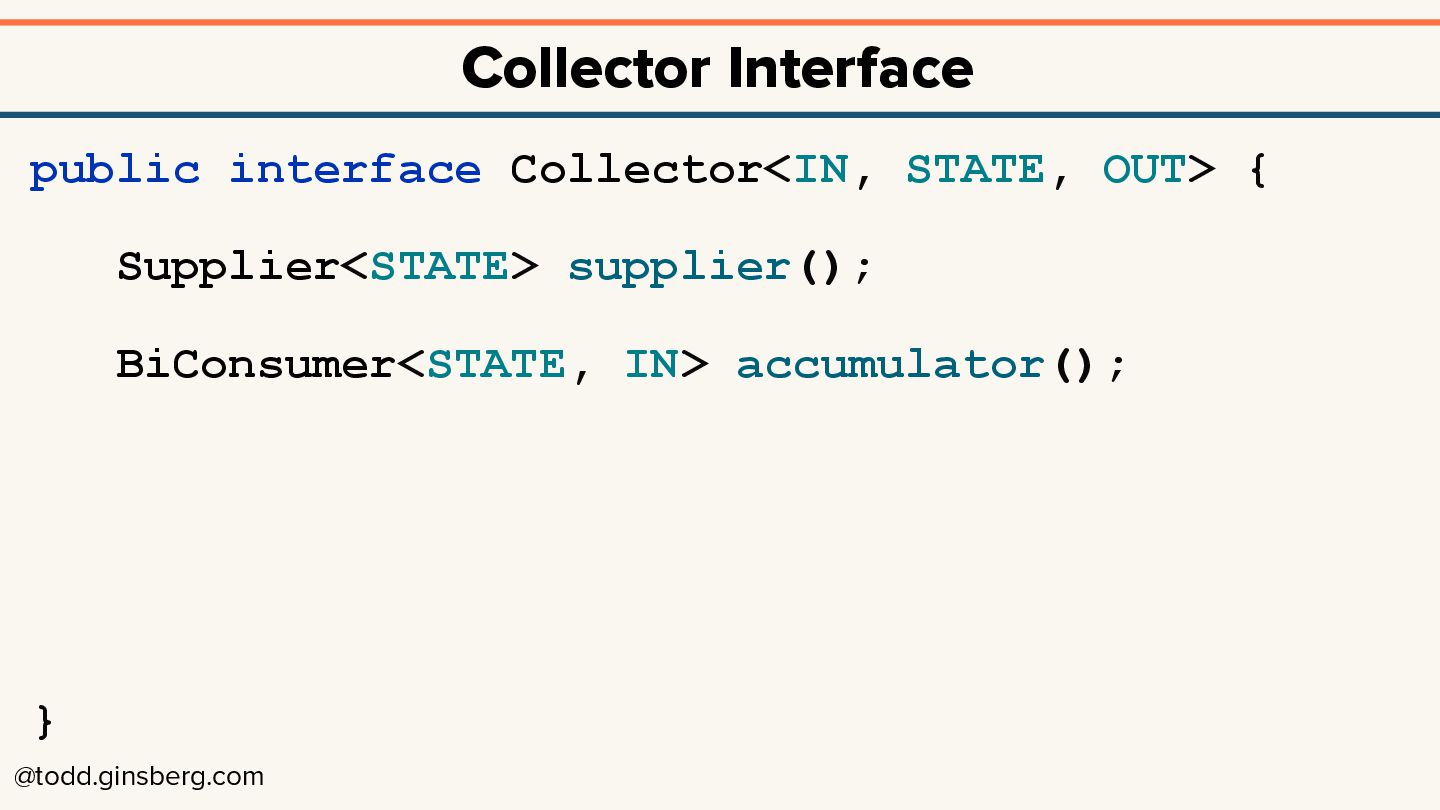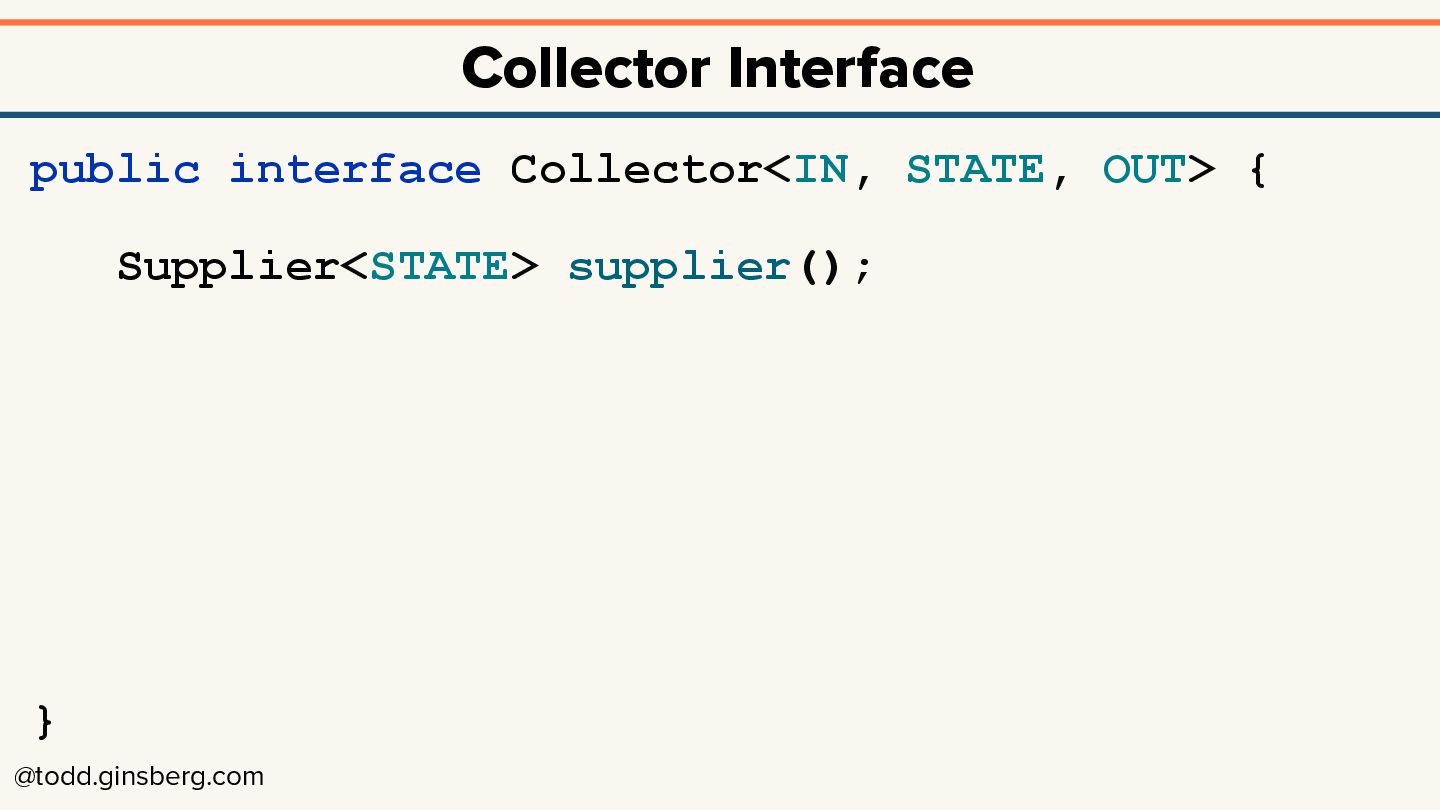 6. @todd.ginsberg.com public interface Collector<IN, STATE, OUT> { Supplier<STATE> supplier(); BiConsumer<STATE,
