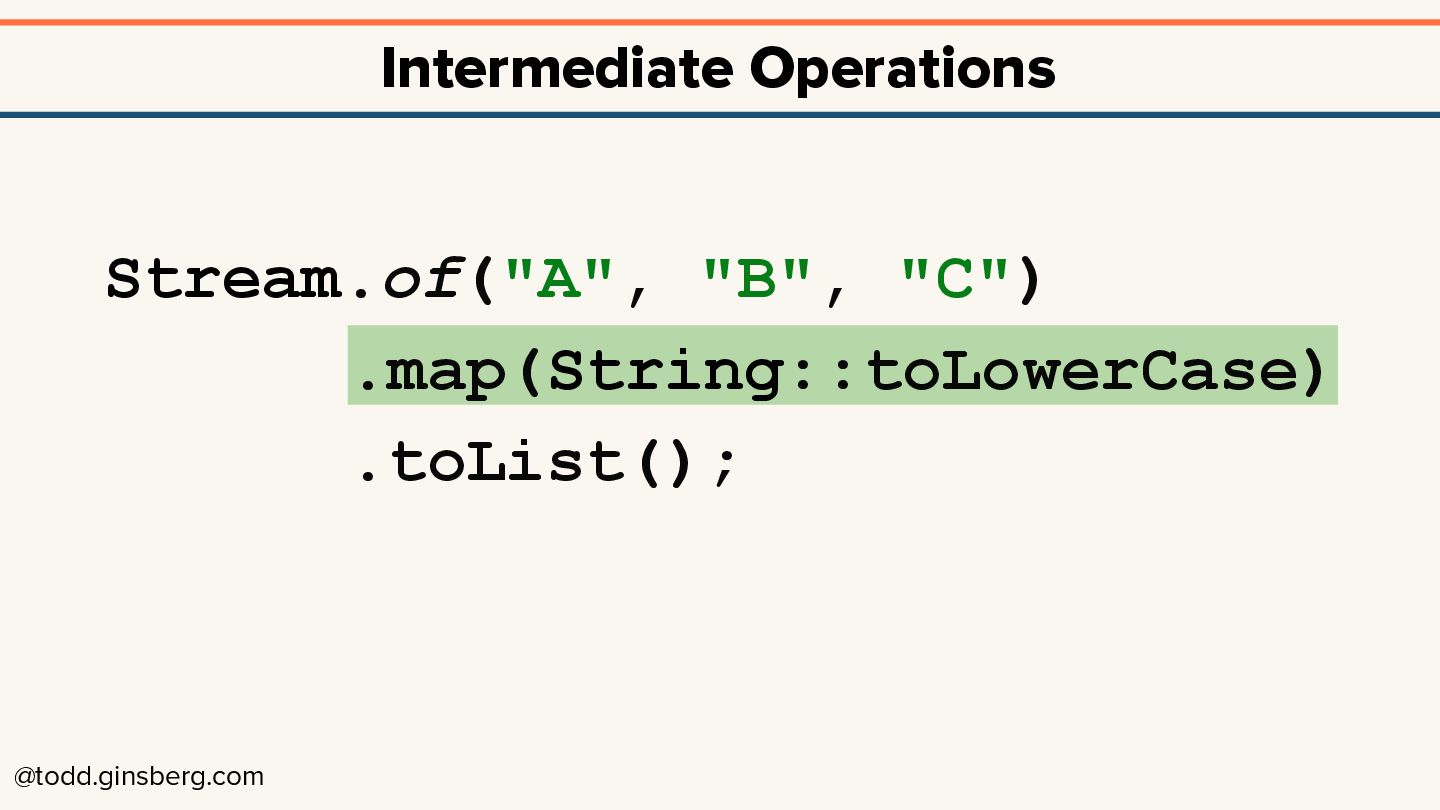 16. @todd.ginsberg.com Anatomy Of A Stream: Intermediate Operations map() mapToInt() mapToLong()