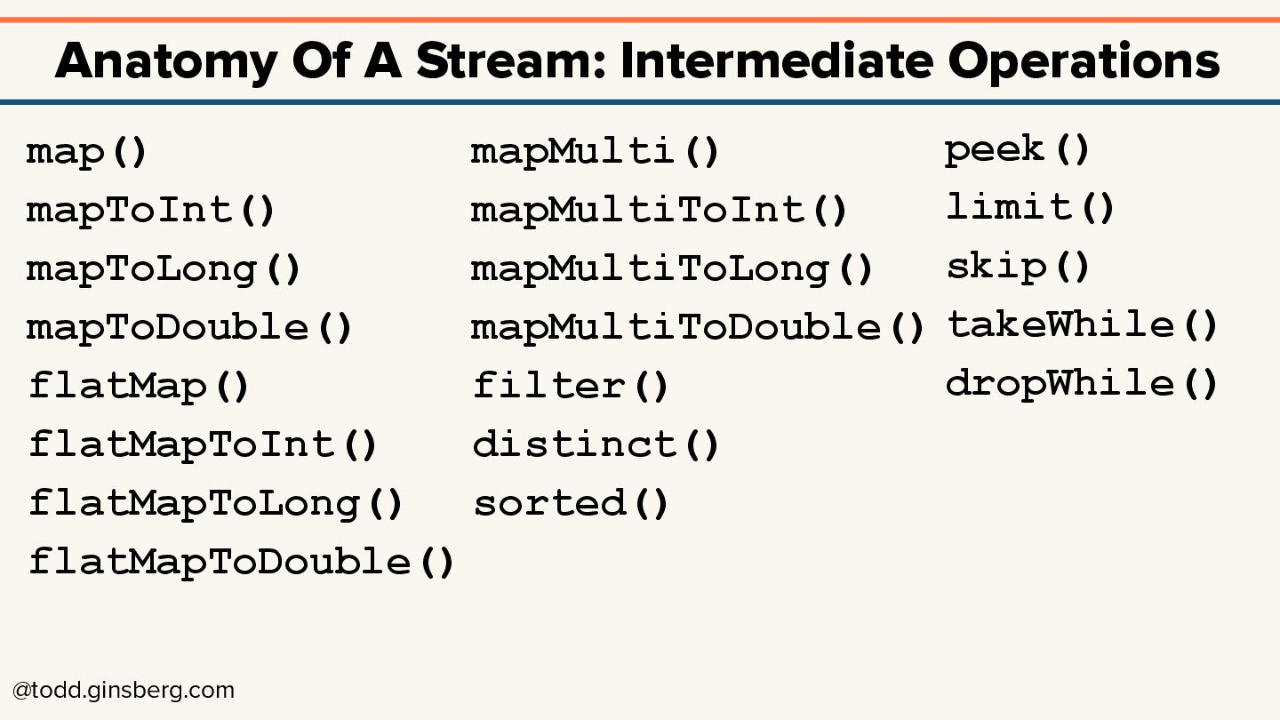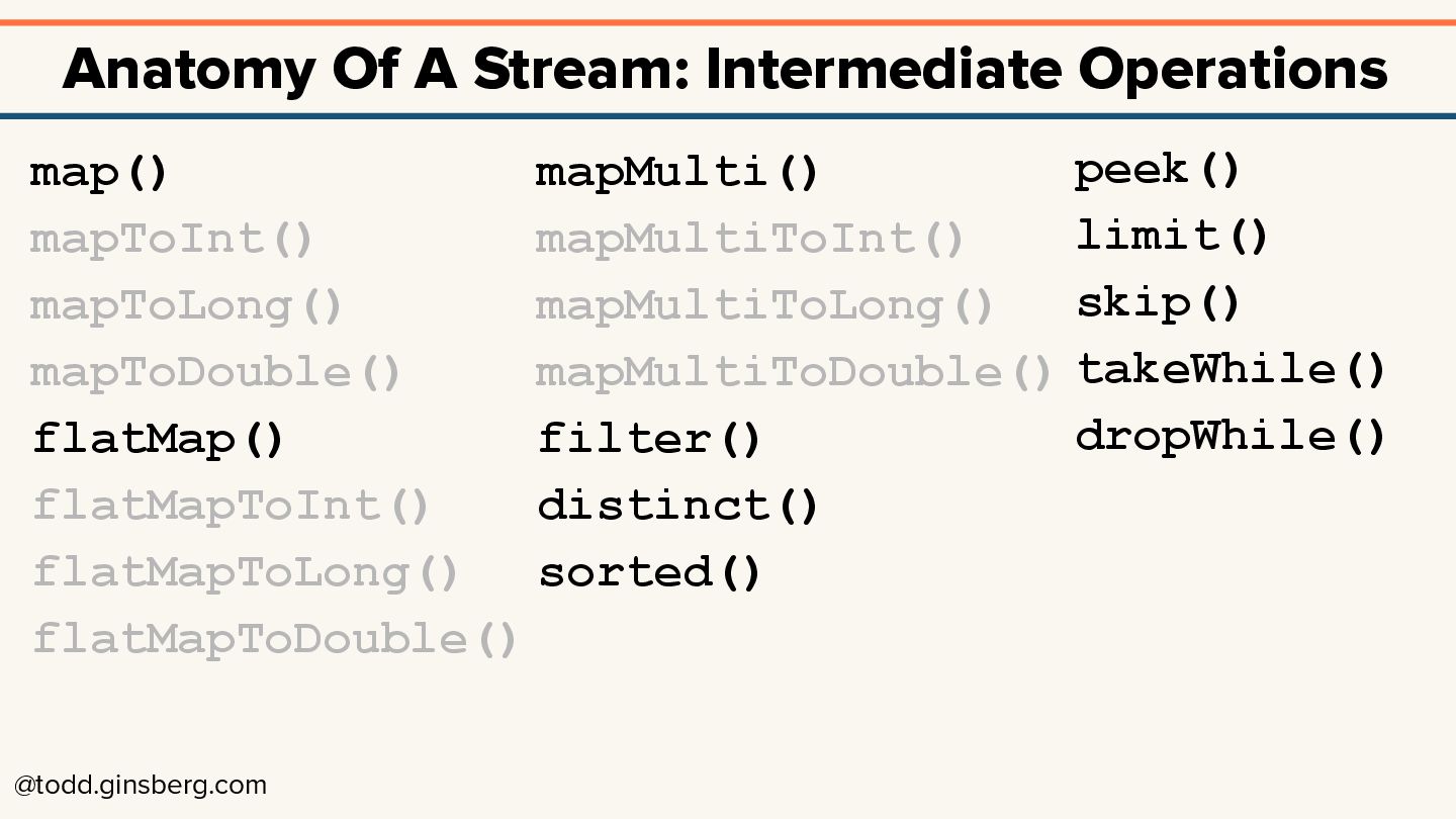 17. @todd.ginsberg.com Anatomy Of A Stream: Intermediate Operations map() flatMap() mapMulti()