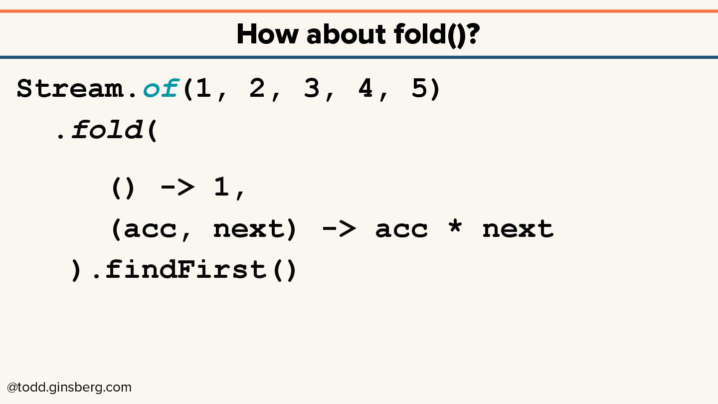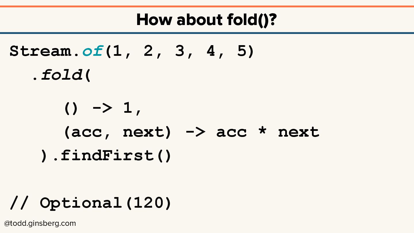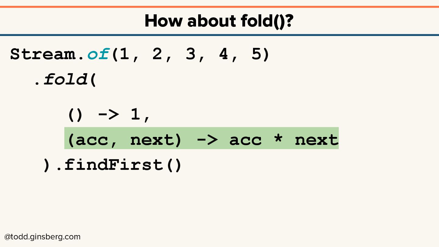 21. @todd.ginsberg.com How about fold()? Stream.of(1, 2, 3, 4, 5) .fold(