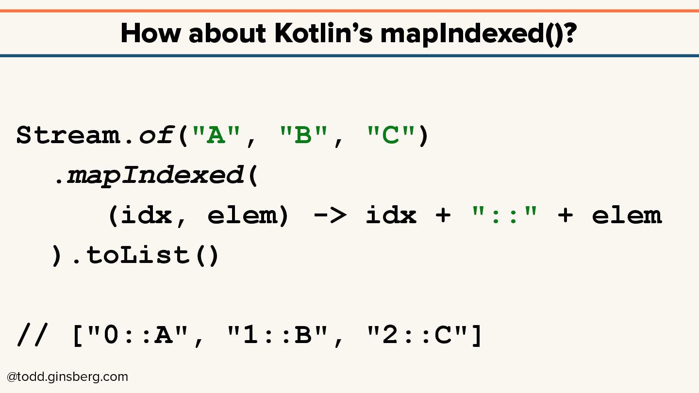 22. @todd.ginsberg.com How about Kotlin’s mapIndexed()? Stream.of("A", "B", "C") .mapIndexed( (idx,