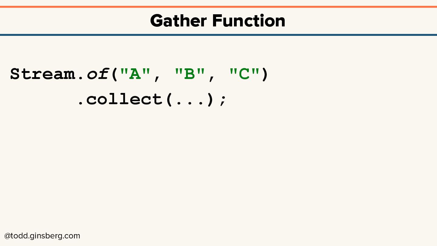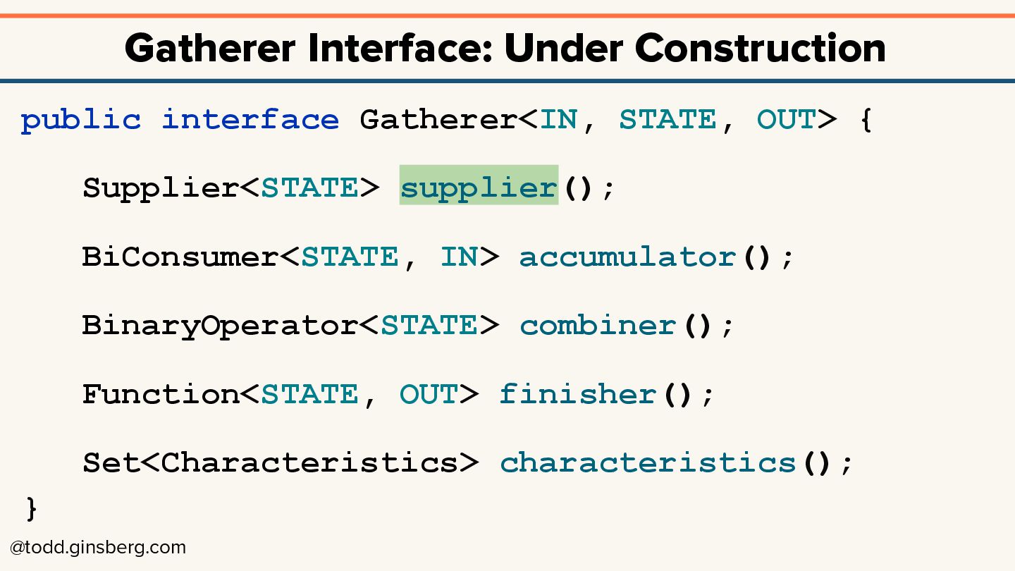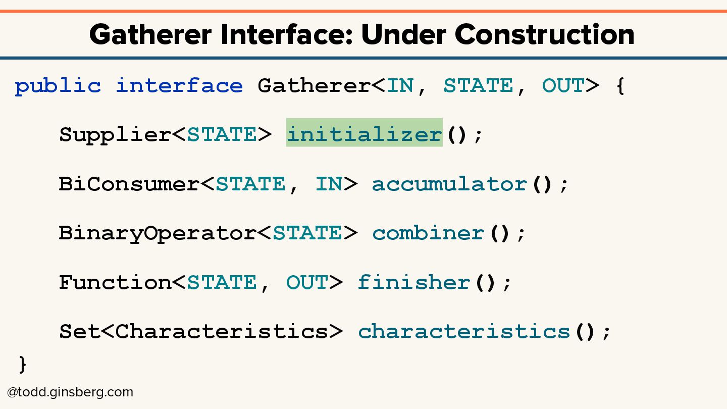 54. @todd.ginsberg.com public interface Gatherer<IN, STATE, OUT> { Supplier<STATE> initializer(); Integrator<STATE,