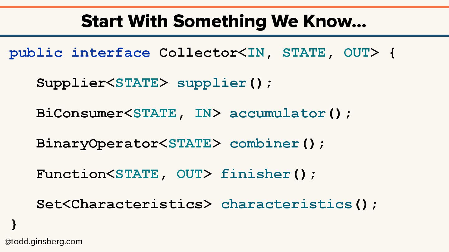 IN> accumulator(); BinaryOperator<STATE> combiner(); Function<STATE, OUT> finisher(); Set<Characteristics> characteristics(); } Start With Something We Know…