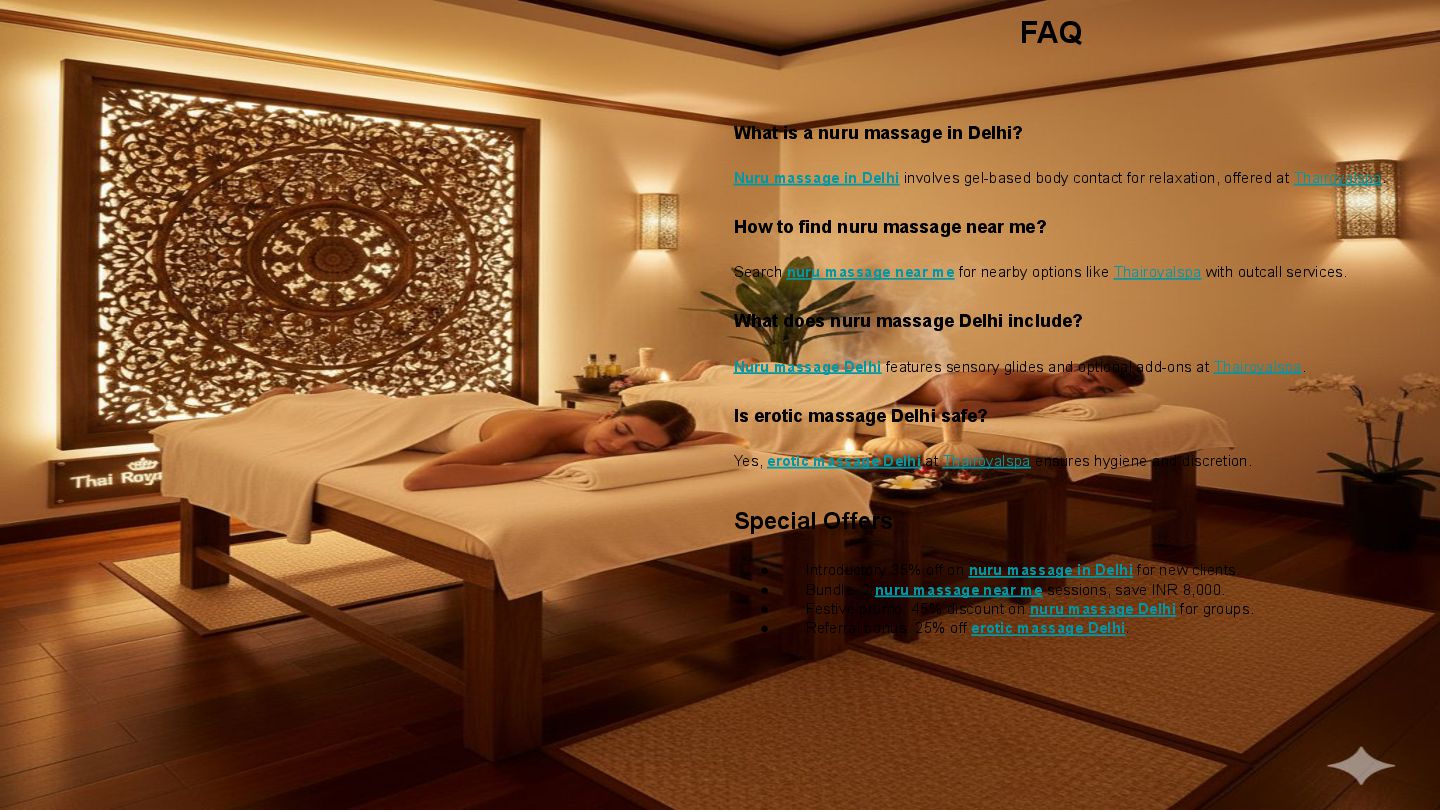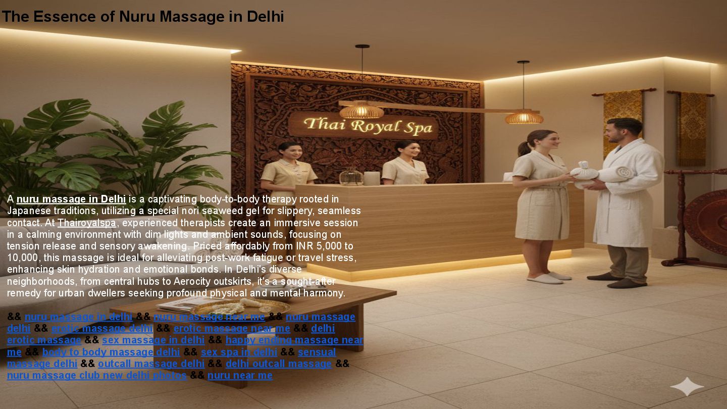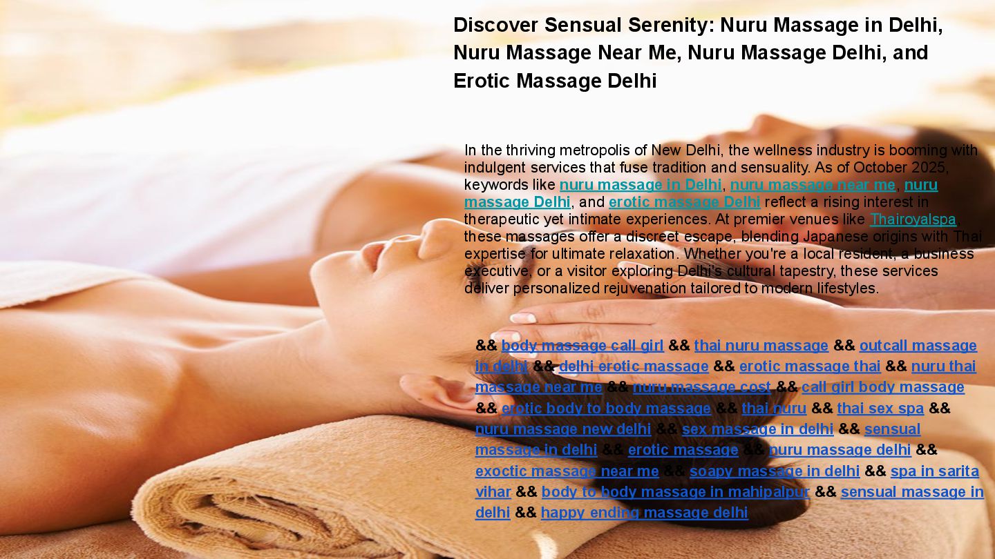 In the dynamic city of Delhi, the pursuit of ultimate relaxation has evolved into a blend of traditional therapies and sensual experiences. Keywords such as erotic massage thai, nuru thai massage near me, nuru massage cost, and call girl body massage highlight popular services that cater to those seeking rejuvenation and intimacy. At premier centers like Thairoyalspa, these offerings combine ancient Thai techniques with modern sensual elements, providing discreet, professional sessions for tourists, professionals, and locals. Whether you're near Aerocity or a railway station, these massages promise stress relief, enhanced well-being, and a touch of luxury.