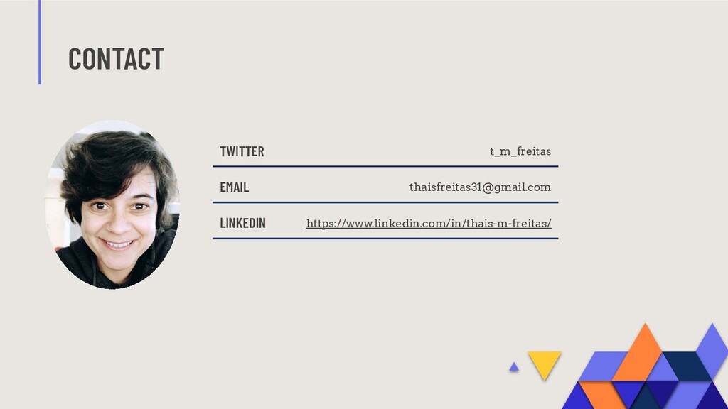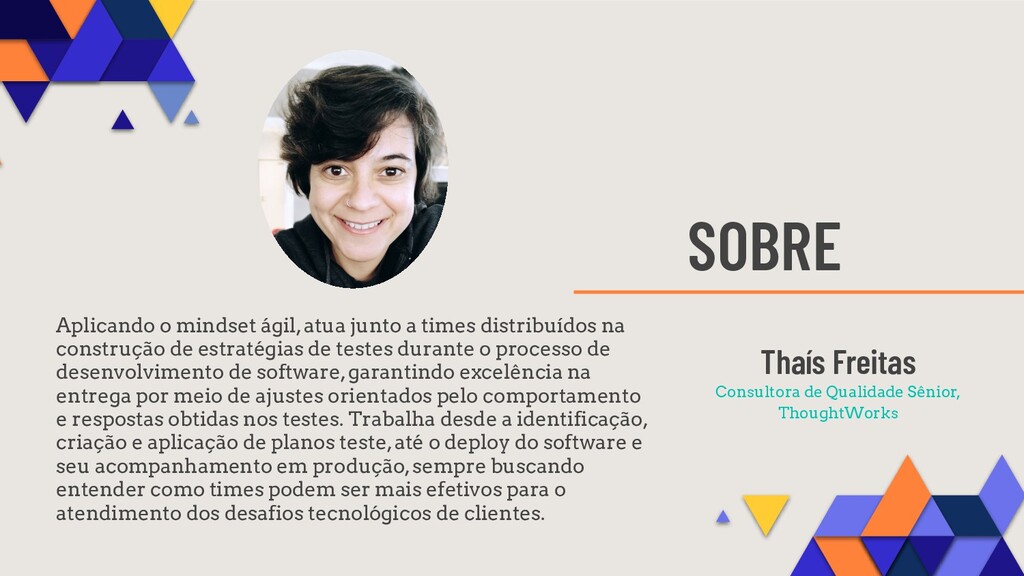 na construção de estratégias de testes durante o processo de desenvolvimento de software, garantindo excelência na entrega por meio de ajustes orientados pelo comportamento e respostas obtidas nos testes. Trabalha desde a identificação, criação e aplicação de planos teste, até o deploy do software e seu acompanhamento em produção, sempre buscando entender como times podem ser mais efetivos para o atendimento dos desafios tecnológicos de clientes. Thaís Freitas Consultora de Qualidade Sênior, ThoughtWorks