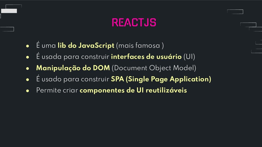 • É usada para construir interfaces de usuário (UI) • Manipulação do DOM (Document Object Model) • É usado para construir SPA (Single Page Application) • Permite criar componentes de UI reutilizáveis