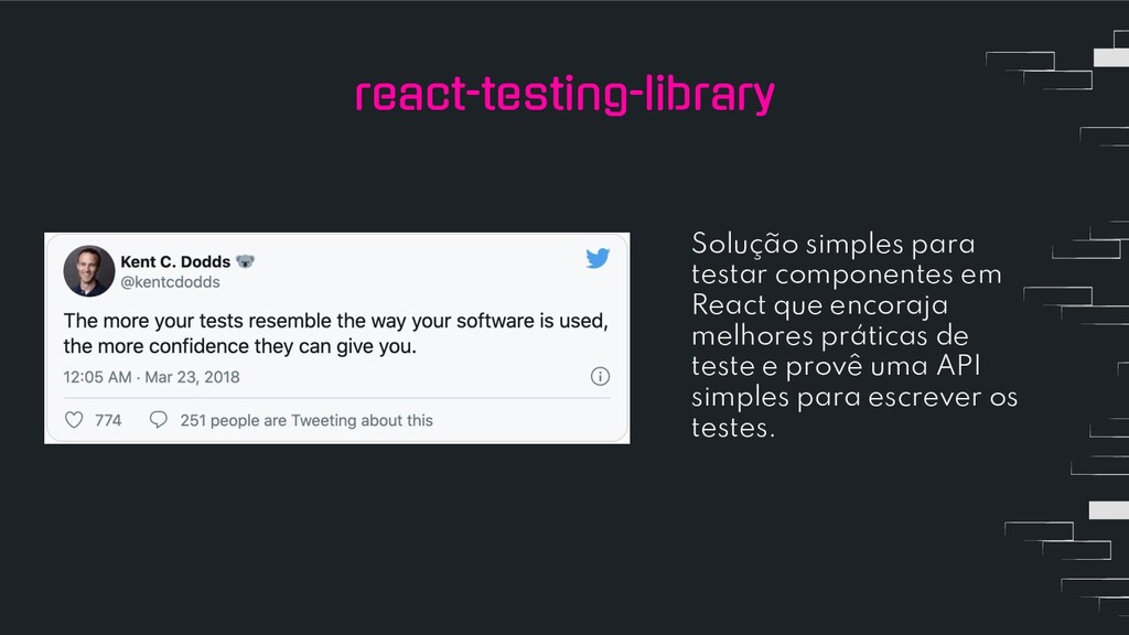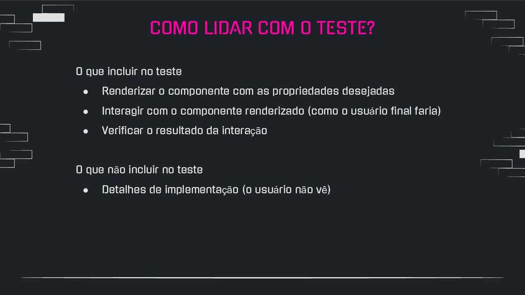 as propriedades desejadas • Interagir com o componente renderizado (como o usuário final faria) • Verificar o resultado da interação O que não incluir no teste • Detalhes de implementação (o usuário não vê) COMO LIDAR COM O TESTE?