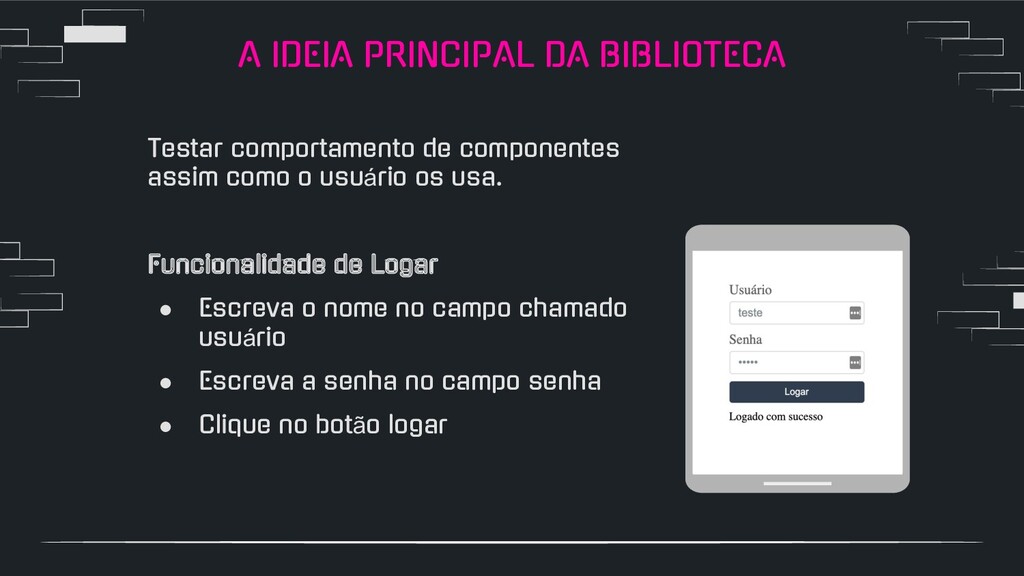 Funcionalidade de Logar • Escreva o nome no campo chamado usuário • Escreva a senha no campo senha • Clique no botão logar A IDEIA PRINCIPAL DA BIBLIOTECA