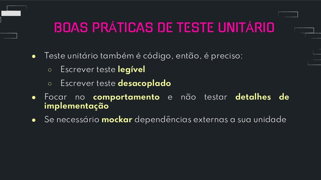 Escrever teste legível ◦ Escrever teste desacoplado • Focar no comportamento e não testar detalhes de implementação • Se necessário mockar dependências externas a sua unidade BOAS PRÁTICAS DE TESTE UNITÁRIO