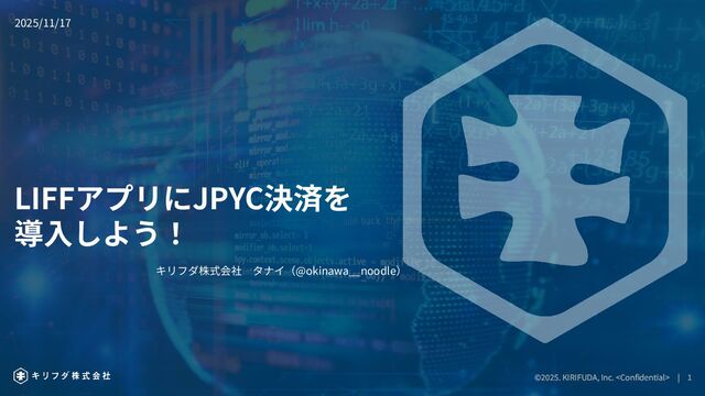 ©2025. KIRIFUDA, Inc. <Confidential> | 1 ©2025. KIRIFUDA, Inc. <Confidential> | 1 LIFFアプリにJPYC決済を 導⼊しよう!