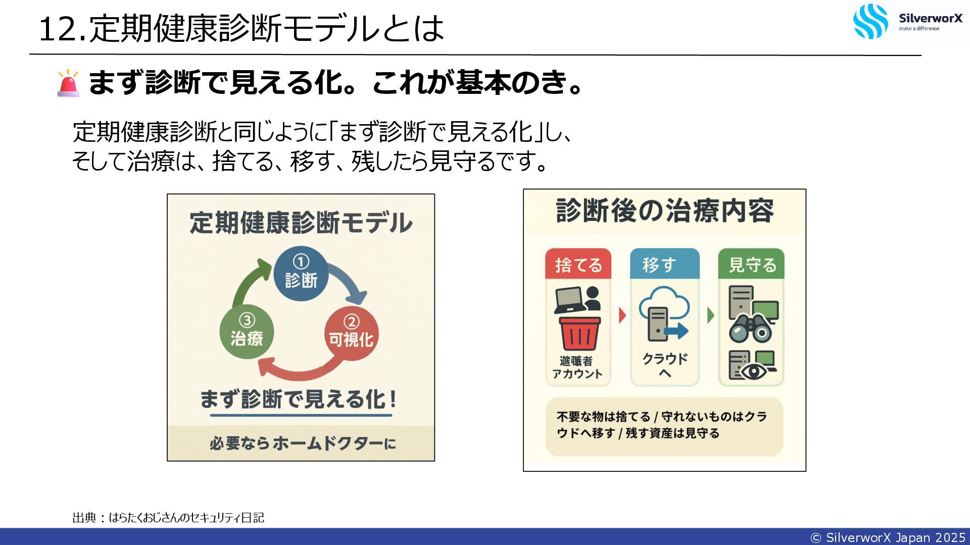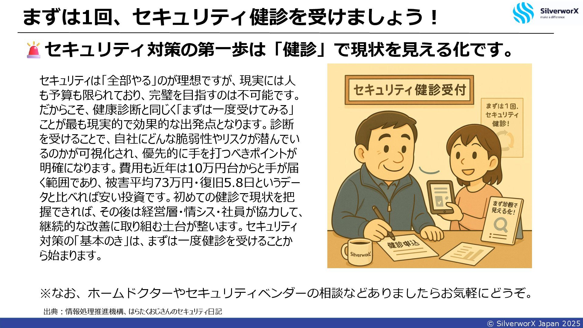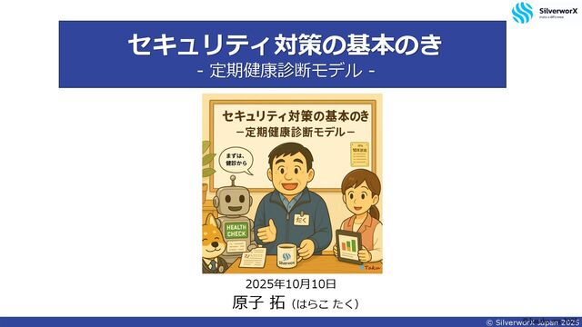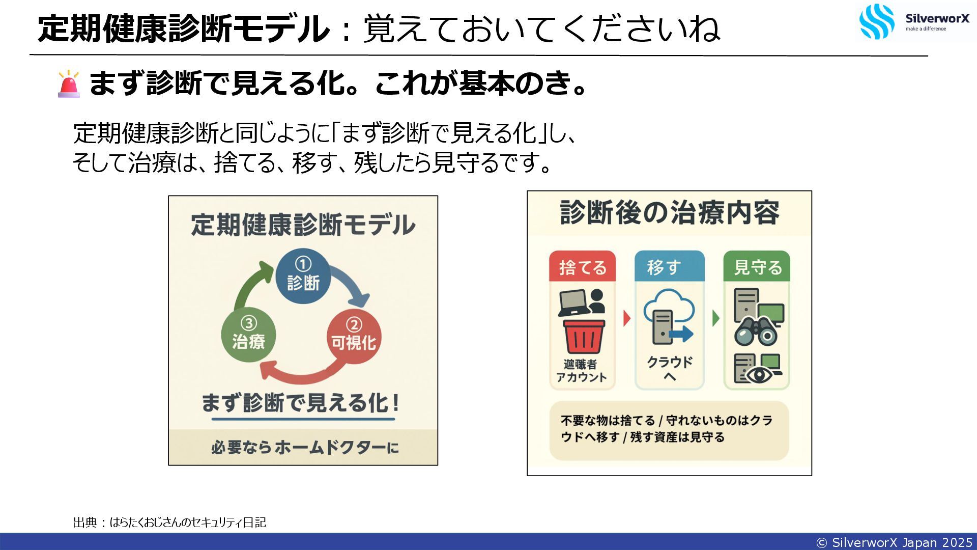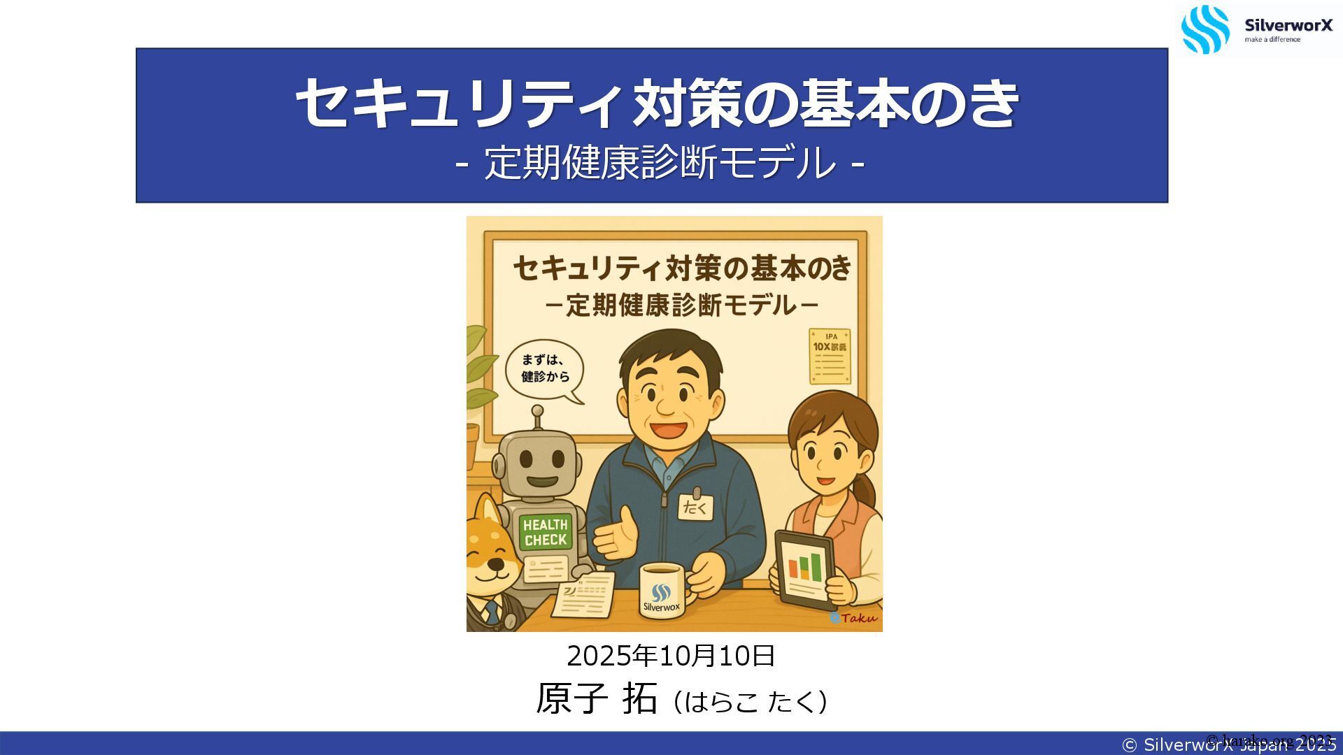 #Security #CyberSecurity #HealthCheckModel #ShiftAndCut #SilverworX #DX #クラウド移行 #中小企業セキュリティ #セキュリティ対策の基本のき #定期健診モデル #未来への投資 #はらたくおじさん #原子拓