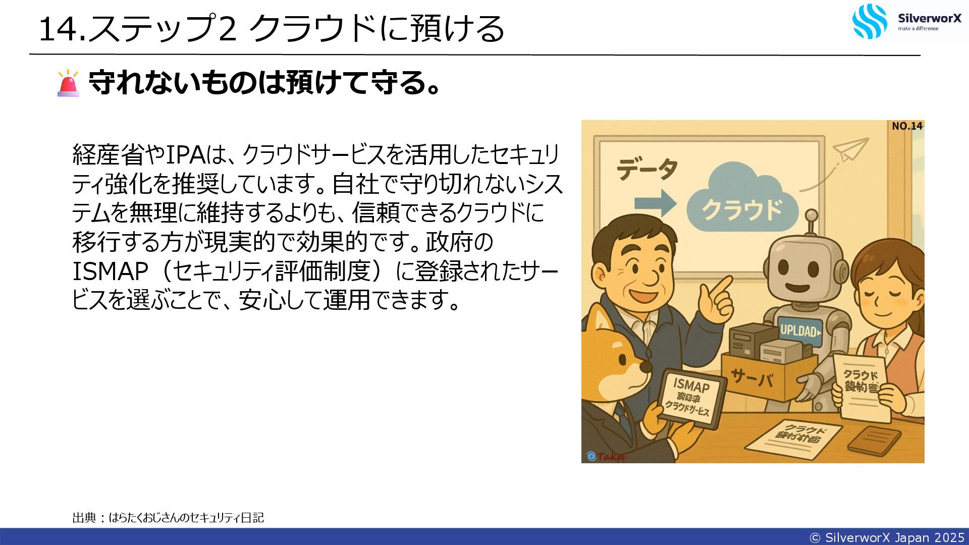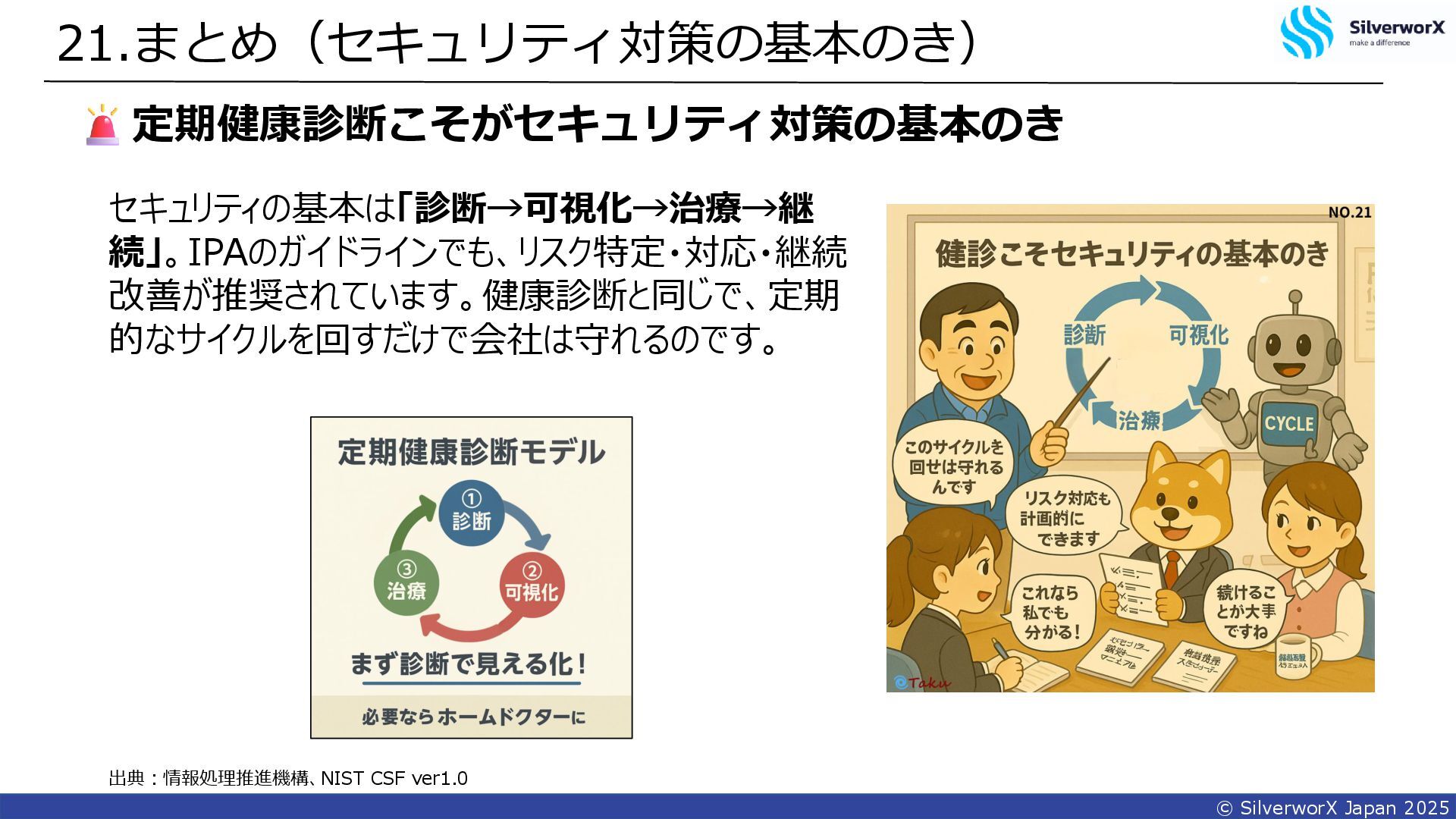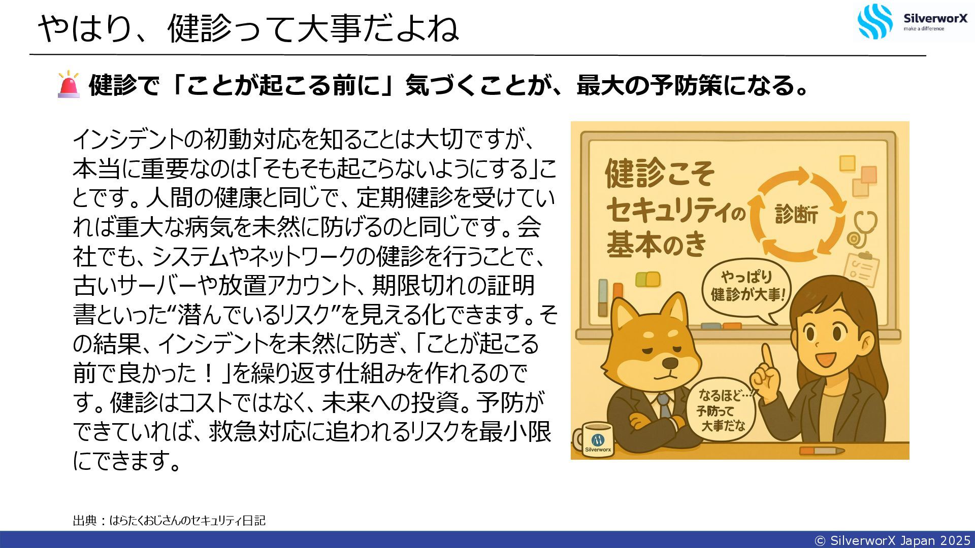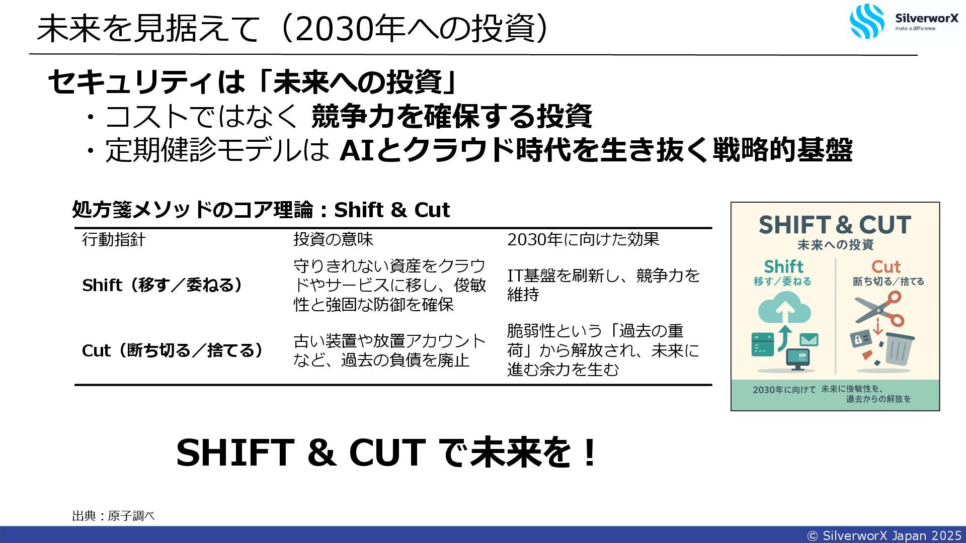 #Security #CyberSecurity #HealthCheckModel #ShiftAndCut #SilverworX #DX #クラウド移行 #中小企業セキュリティ #セキュリティ対策の基本のき #定期健診モデル #未来への投資 #はらたくおじさん #原子拓