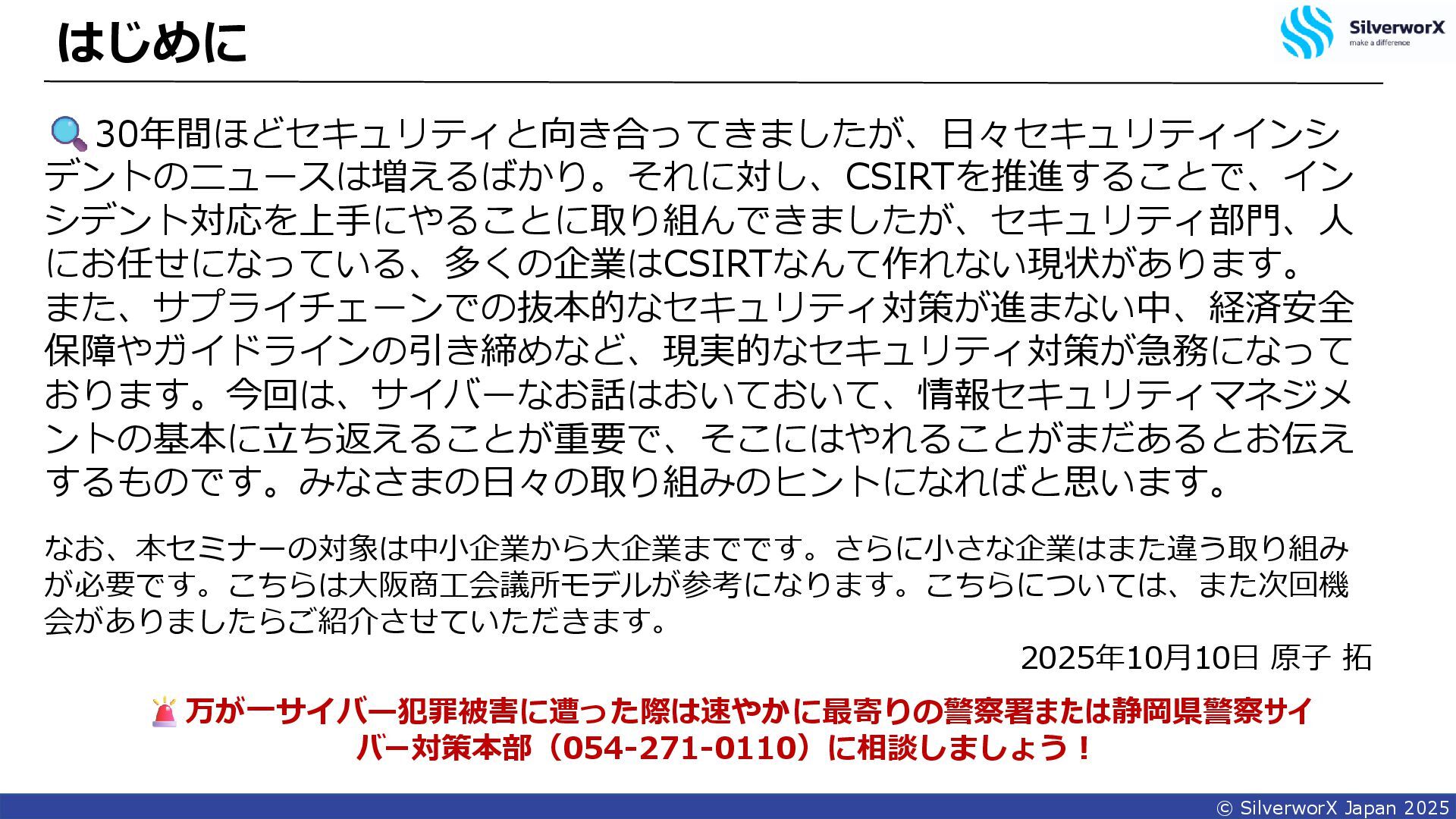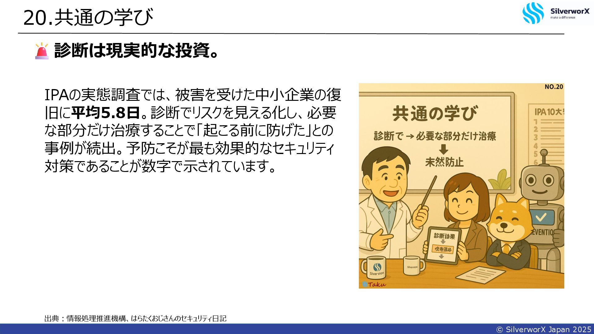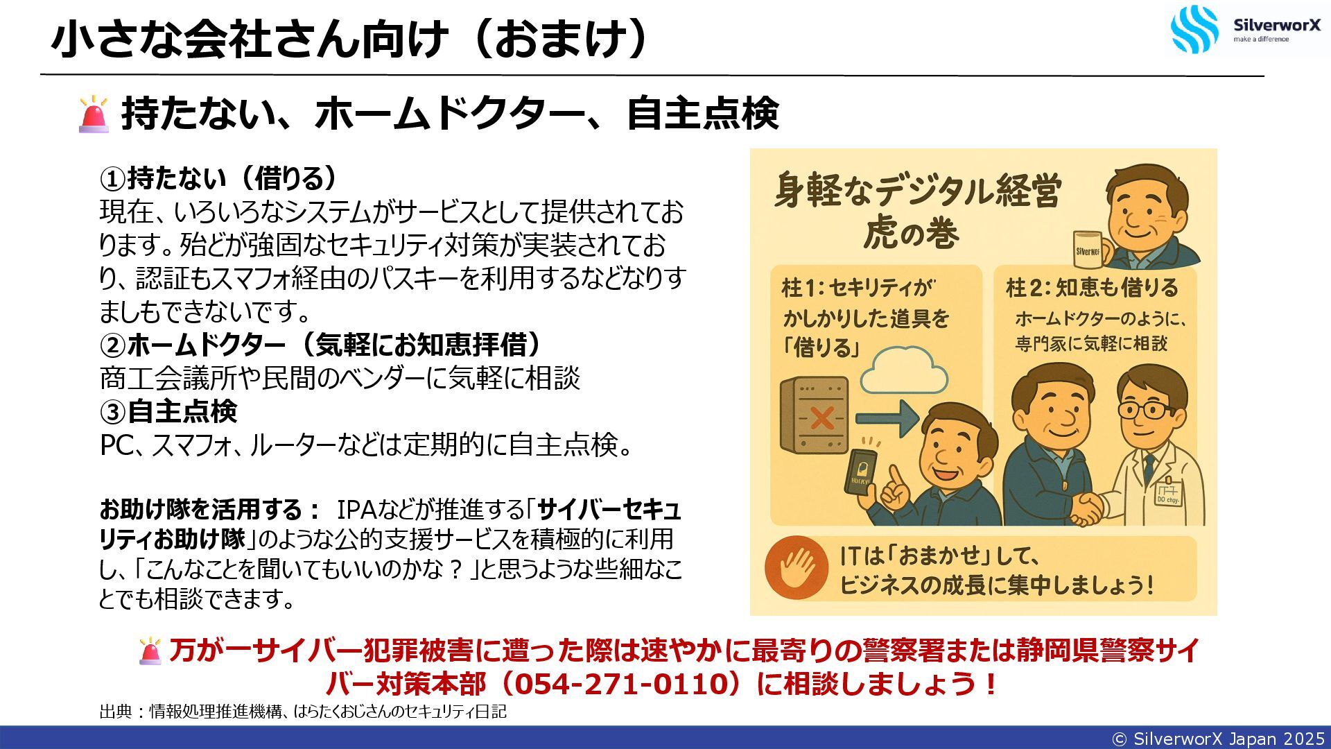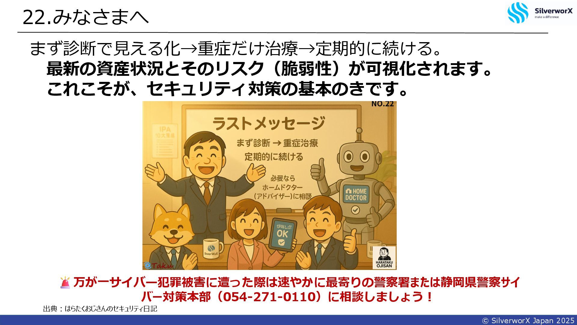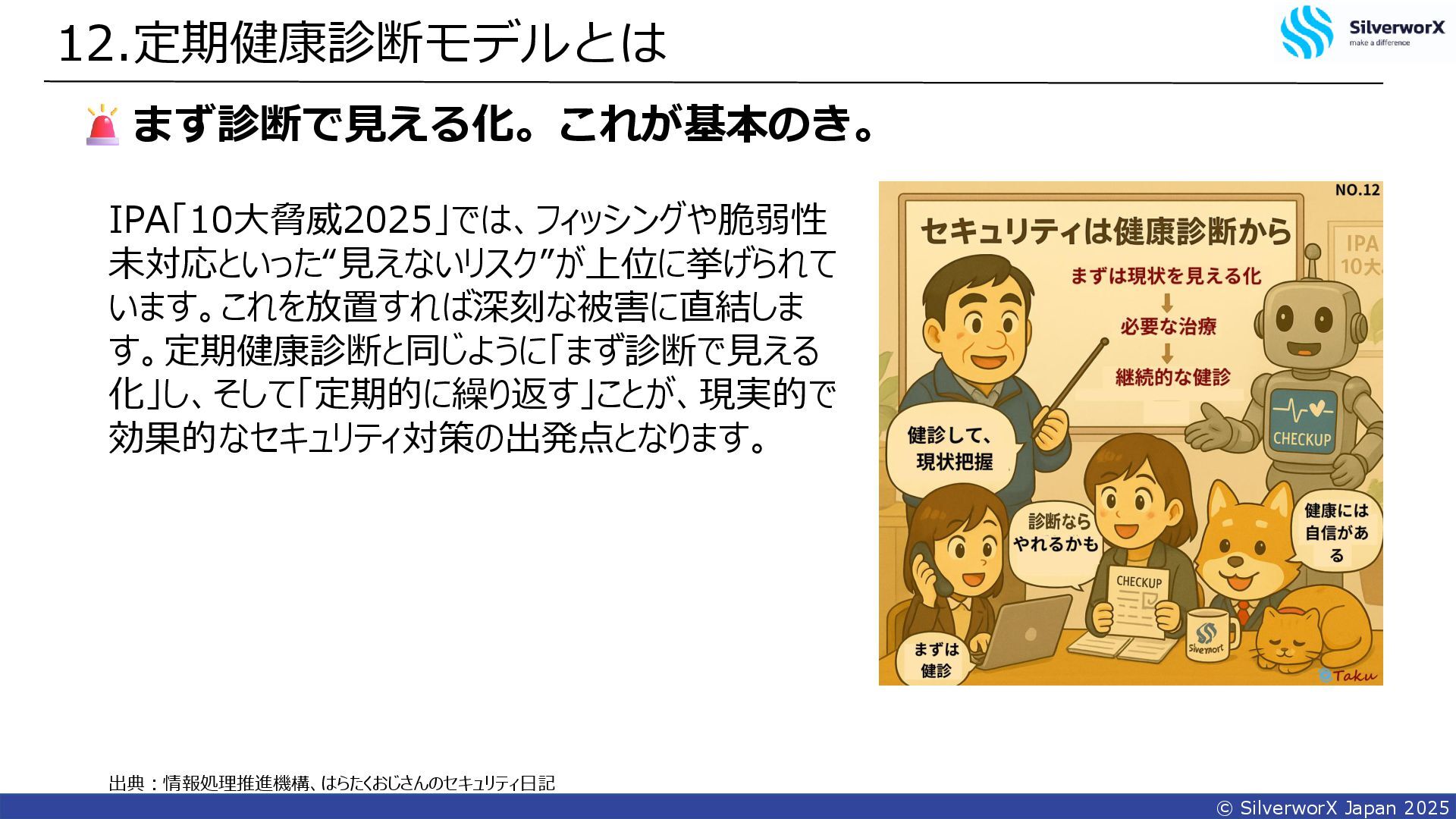 #Security #CyberSecurity #HealthCheckModel #ShiftAndCut #SilverworX #DX #クラウド移行 #中小企業セキュリティ #セキュリティ対策の基本のき #定期健診モデル #未来への投資 #はらたくおじさん #原子拓