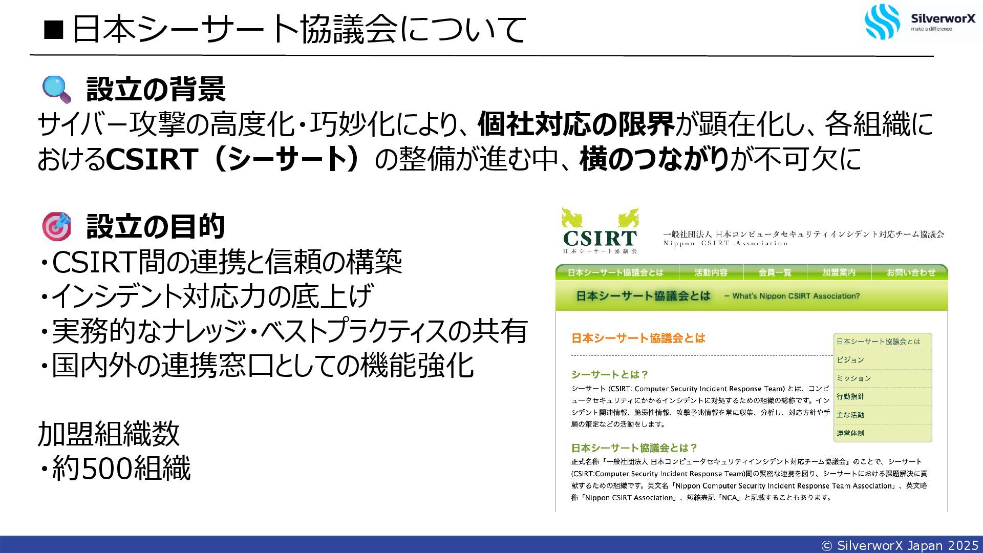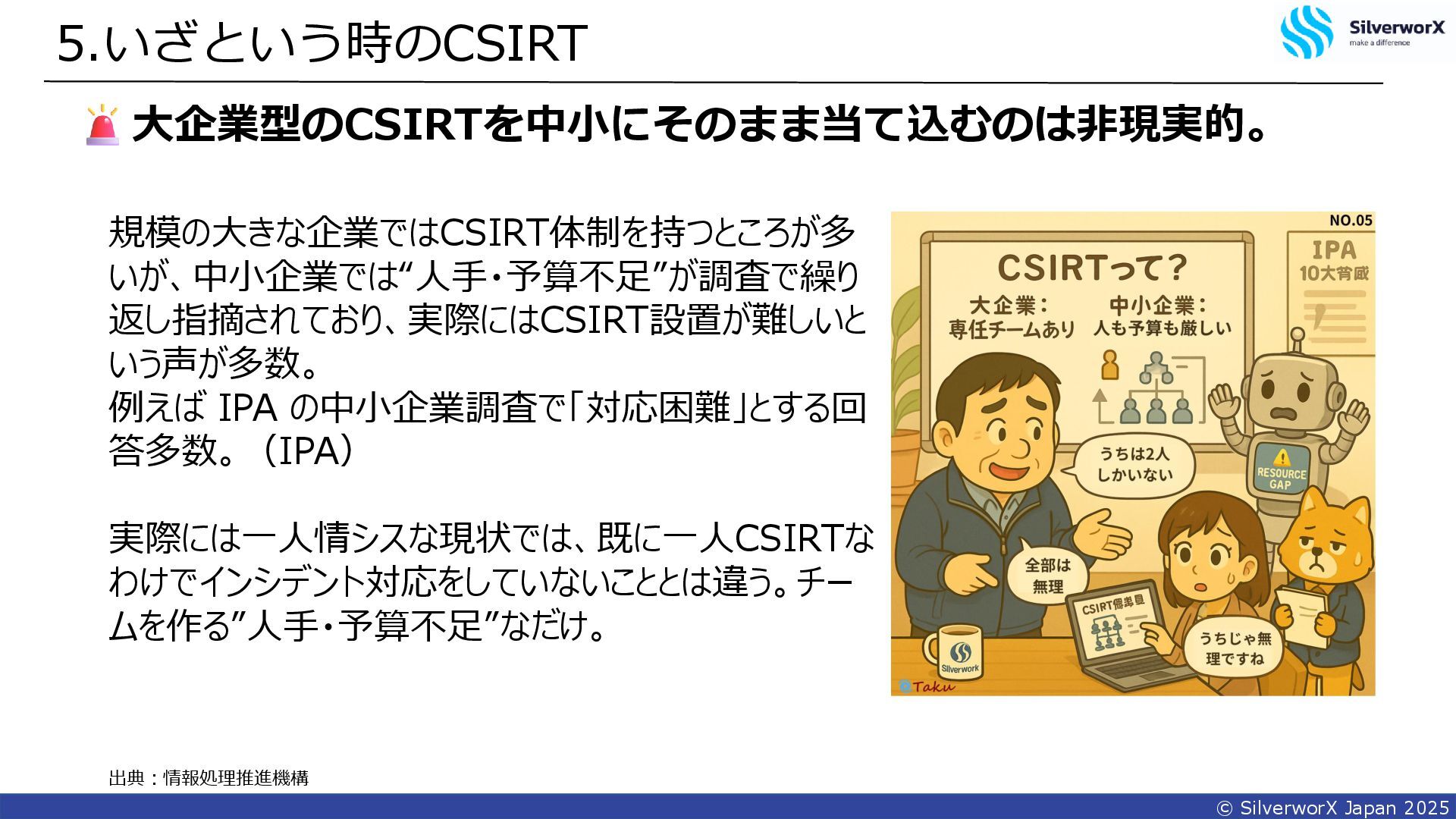 30年間ほどセキュリティと向き合ってきましたが、日々セキュリティインシデントのニュースは増えるばかり。それに対し、CSIRTを推進することで、インシデント対応を上手にやることに取り組んできましたが、セキュリティ部門、人にお任せになっている、多くの企業はCSIRTなんて作れない現状があります。