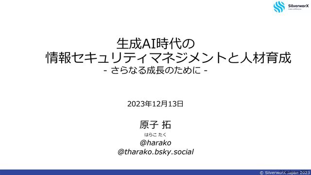 成する Text to image AI が話題になり、その後、⽂章を書くAIとし て2022年末に”ChatGPT”がリリースされてテキスト⽣成AIの進化にみ んなが驚きブームとなった。 当然、企業でもビジネスへの活⽤が検討され、すでに活⽤事例を⽬に するようになっています。⼀⽅で、セキュリティ⾯については、 なりすましや詐欺、プライバシーや権利の侵害、サイバー攻撃などセ キュリティ⾯のリスクがあり、対応が必要となります。 注)原⼦調べ