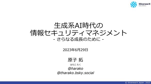 ⽣成系AI(GAI : Generative AI)の登場は新しいイノベーションのひとつと⾔われるほど世の中にインパクトを与えています。新しいイノベーションに対して情報セキュリティマネジメントとしてはリスクを評価・管理するだけでなく、経営ビジョンに従って事業を⽀える必要があります。ここでは企業のさらなる成⻑を⽀える“⽣成AI時代のセキュリティマネジメントのあり⽅”について紹介しています。