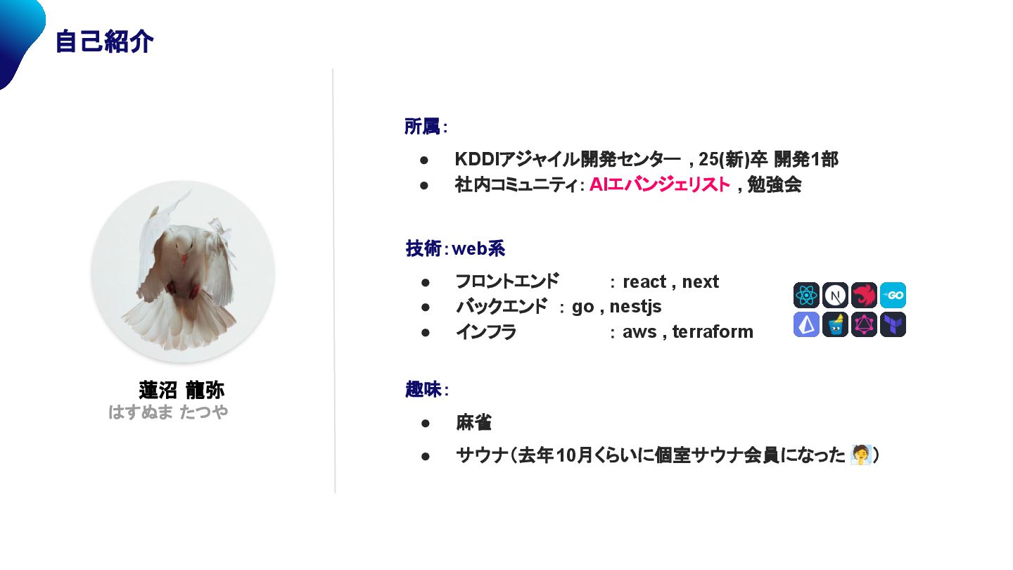 AI Week Day5 蓮沼 龍弥 はすぬま たつや 所属: • KDDIアジャイル開発センター , 25(新)卒 開発1部 • 社内コミュニティ:AIエバンジェリスト , 勉強会 技術:web系 • フロントエンド : react , next • バックエンド : go , nestjs • インフラ : aws , terraform 趣味: • 麻雀 • サウナ(去年10月くらいに個室サウナ会員になった 🧖)