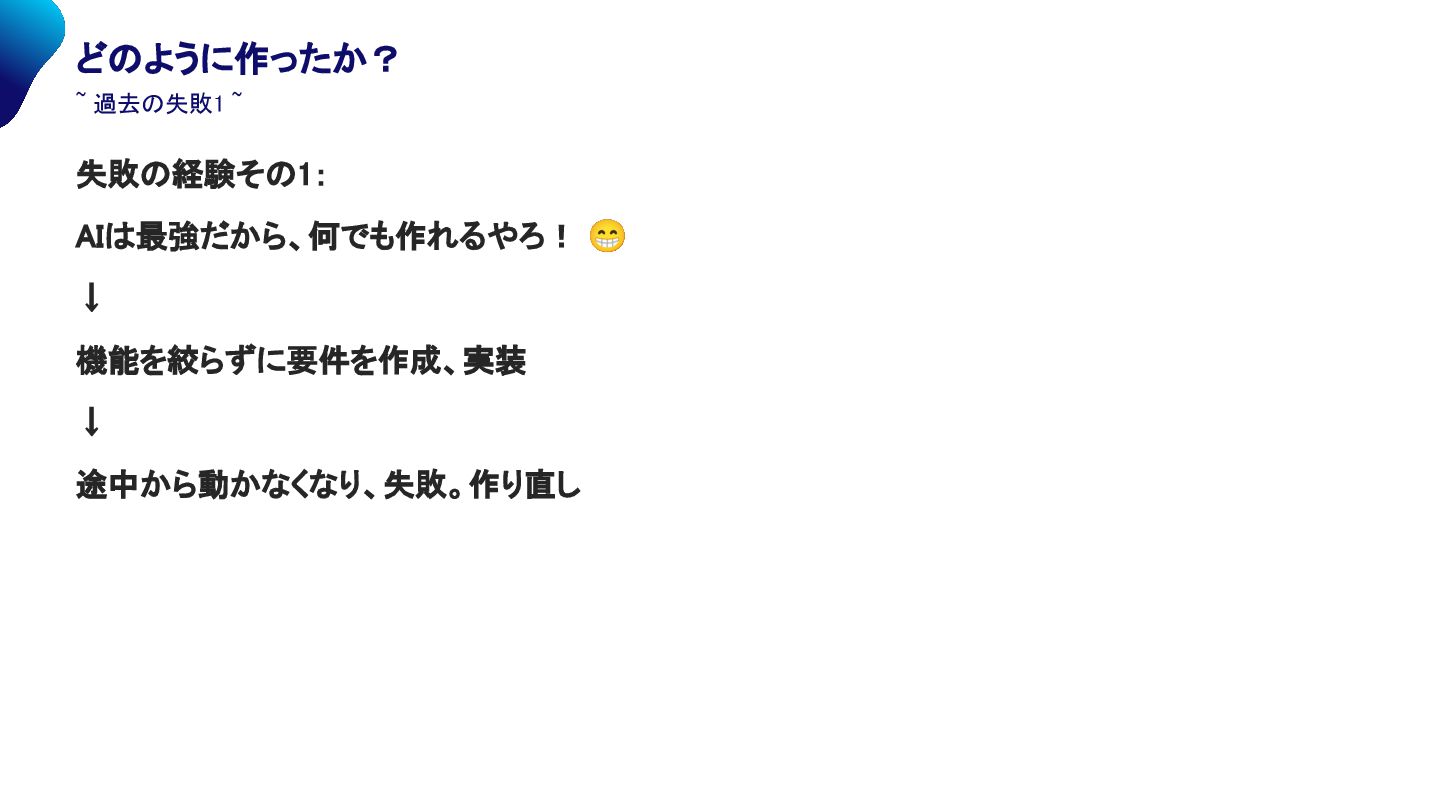 過去の失敗1 ~ 失敗の経験その1: AIは最強だから、何でも作れるやろ! 😁 ↓ 機能を絞らずに要件を作成、実装 ↓ 途中から動かなくなり、失敗。作り直し