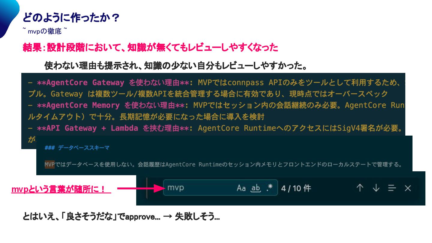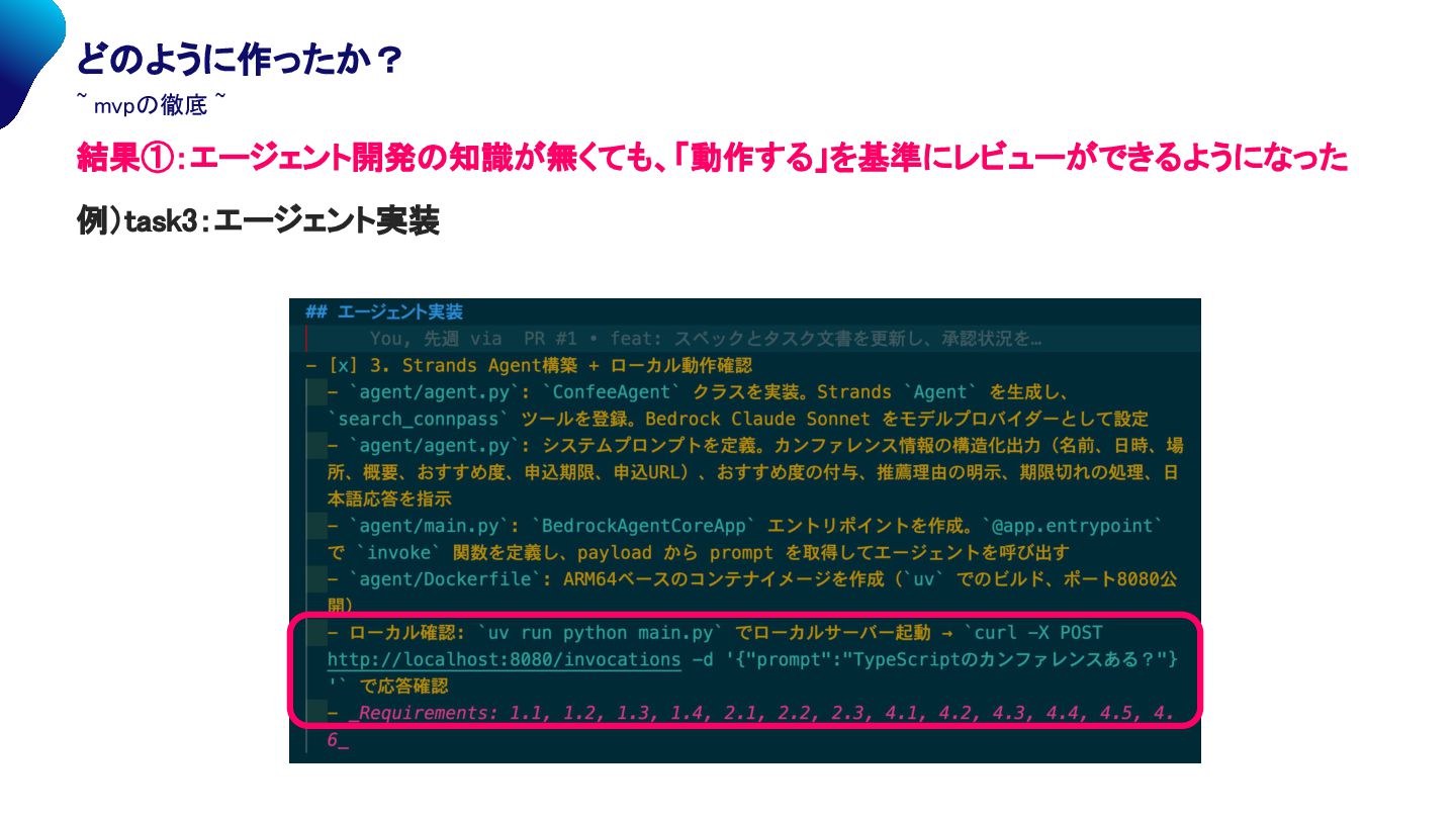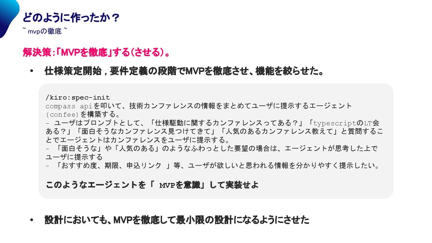 mvpの徹底 ~ 解決策:「MVPを徹底」する(させる)。 • 仕様策定開始 , 要件定義の段階でMVPを徹底させ、機能を絞らせた。 • 設計においても、MVPを徹底して最小限の設計になるようにさせた /kiro:spec-init compass apiを叩いて、技術カンファレンスの情報をまとめてユーザに提示するエージェント (confee)を構築する。 - ユーザはプロンプトとして、「仕様駆動に関するカンファレンスってある?」「typescriptのLT会 ある?」「面白そうなカンファレンス見つけてきて」「人気のあるカンファレンス教えて」と質問するこ とでエージェントはカンファレンスをユーザに提示する。 - 「面白そうな」や「人気のある」のようなふわっとした要望の場合は、エージェントが思考した上で ユーザに提示する - 「おすすめ度、期限、申込リンク 」等、ユーザが欲しいと思われる情報を分かりやすく提示したい。 このようなエージェントを「 MVPを意識」して実装せよ