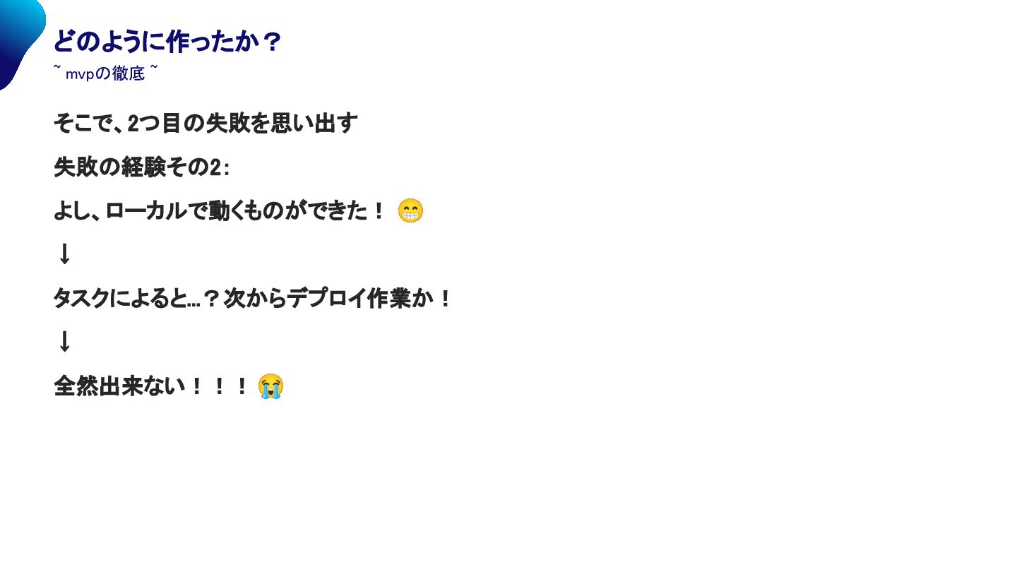 mvpの徹底 ~ そこで、2つ目の失敗を思い出す 失敗の経験その2: よし、ローカルで動くものができた! 😁 ↓ タスクによると...?次からデプロイ作業か! ↓ 全然出来ない!!!😭