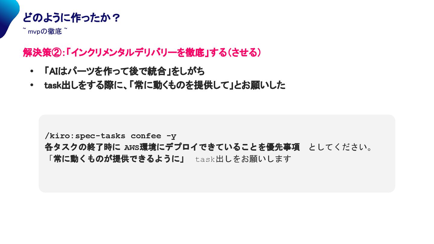 mvpの徹底 ~ 解決策②:「インクリメンタルデリバリーを徹底」する(させる) • 「AIはパーツを作って後で統合」をしがち • task出しをする際に、「常に動くものを提供して」とお願いした /kiro:spec-tasks confee -y 各タスクの終了時に AWS環境にデプロイできていることを優先事項 としてください。 「常に動くものが提供できるように」 task出しをお願いします