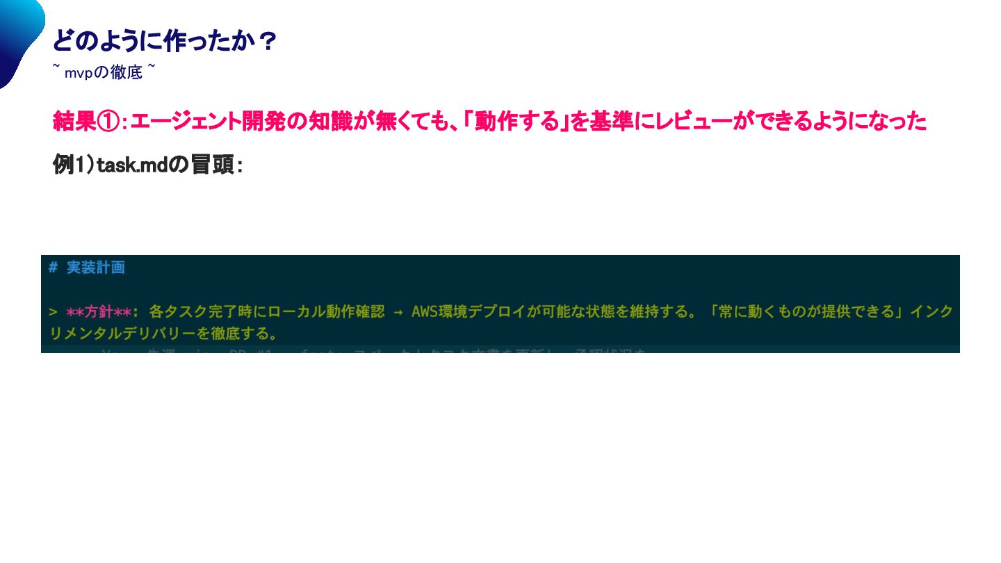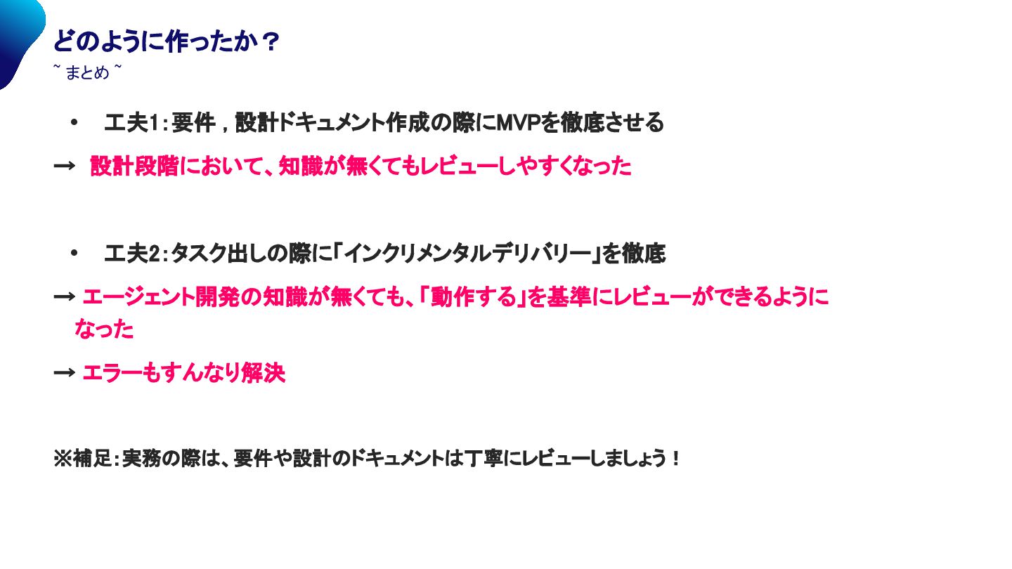 まとめ ~ • 工夫1:要件 , 設計ドキュメント作成の際にMVPを徹底させる → 設計段階において、知識が無くてもレビューしやすくなった • 工夫2:タスク出しの際に「インクリメンタルデリバリー」を徹底 → エージェント開発の知識が無くても、「動作する」を基準にレビューができるように なった → エラーもすんなり解決 ※補足:実務の際は、要件や設計のドキュメントは丁寧にレビューしましょう!