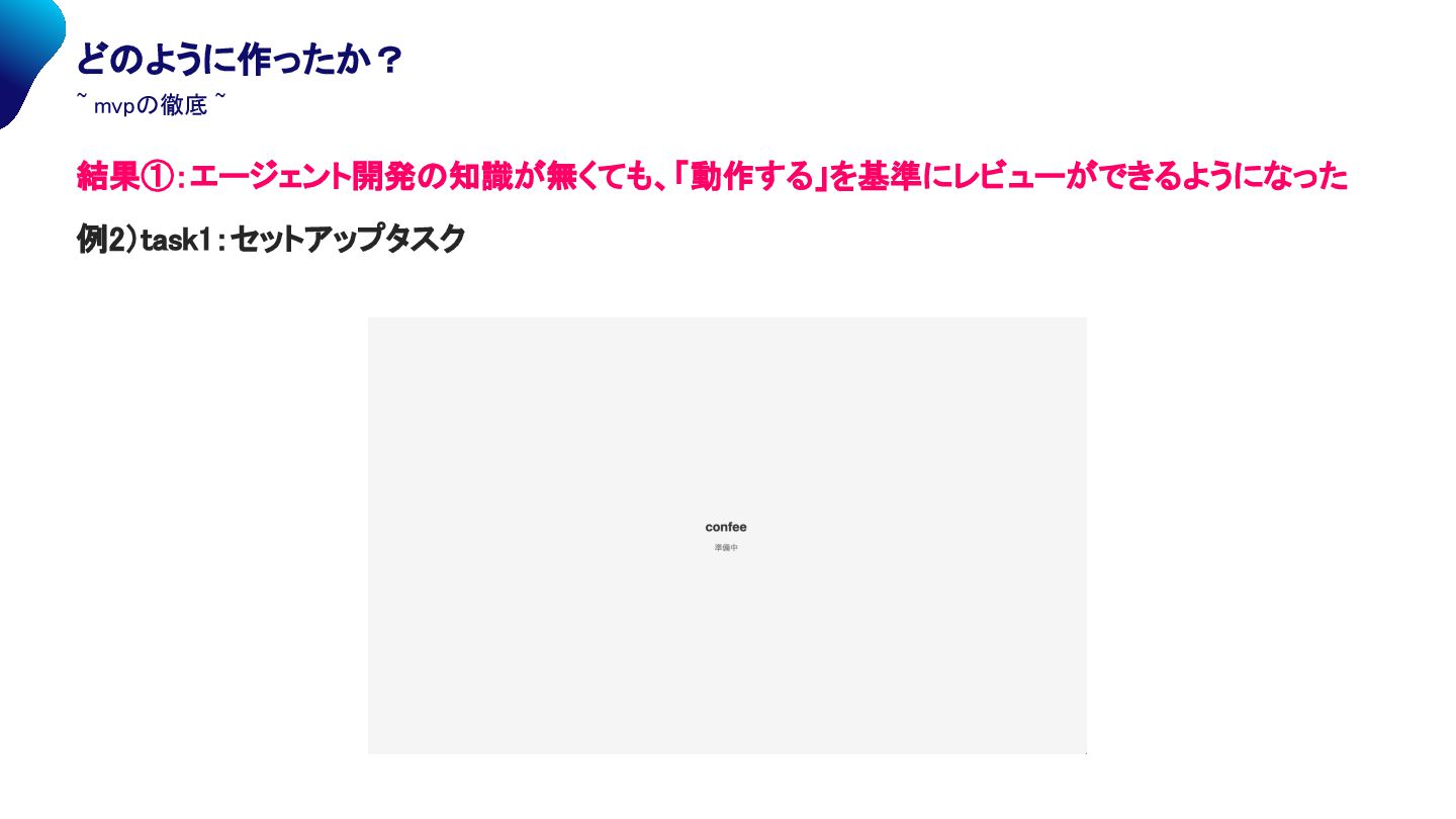 mvpの徹底 ~ 結果①:エージェント開発の知識が無くても、「動作する」を基準にレビューができるようになった 例2)task1:セットアップタスク