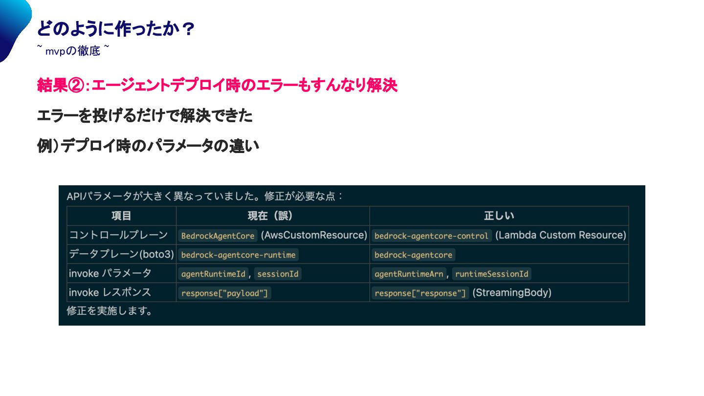 mvpの徹底 ~ 結果②:エージェントデプロイ時のエラーもすんなり解決 エラーを投げるだけで解決できた 例)デプロイ時のパラメータの違い