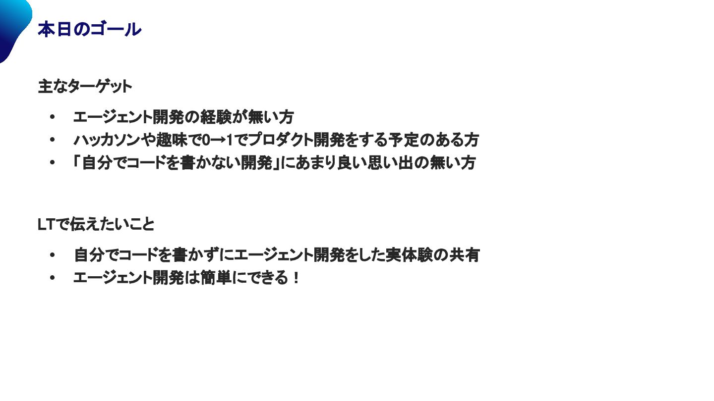 • エージェント開発の経験が無い方 • ハッカソンや趣味で0→1でプロダクト開発をする予定のある方 • 「自分でコードを書かない開発」にあまり良い思い出の無い方 LTで伝えたいこと • 自分でコードを書かずにエージェント開発をした実体験の共有 • エージェント開発は簡単にできる!